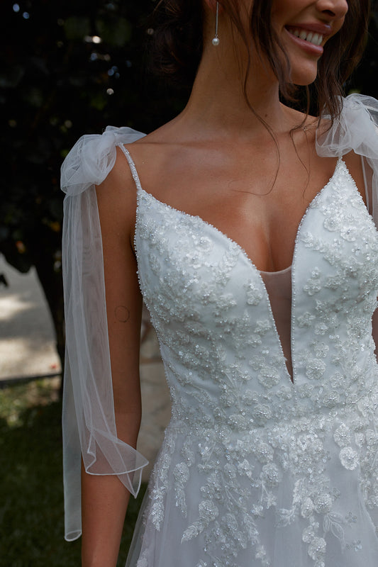 Skimming over the hips, A-line bridal gowns are a popular and flattering option for brides. This silhouette is available in many fabrics, including tulle, chiffon and satin.