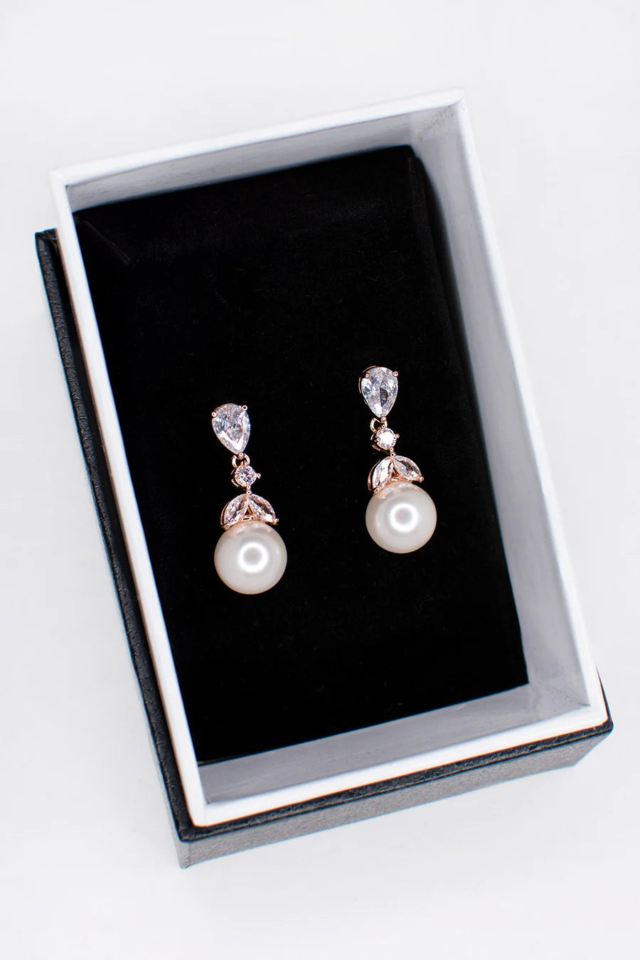 Held by a gleaming teardrop crystal at the post, Betty's dainty single Pearl is surrounded by leaf like navette shaped crystals that carry worlds full of light and shine. Beautifully set in rose gold plating, Betty is a charming pair of bridal earrings suitable for brides, bridesmaids and formal wear.