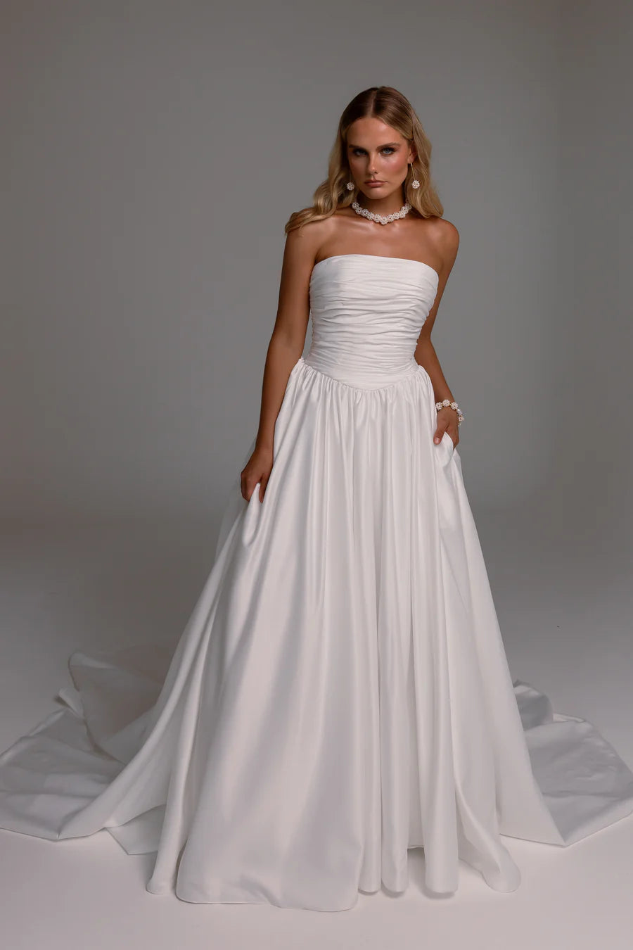Timeless elegance meets modern romance in our Octavia wedding dress, thoughtfully designed for the bride who values classic beauty with elevated detail. Crafted from luxurious satin, the strapless bodice features built-in nude bra cups for comfort and support, with soft ruching across the front and back that flatters the figure and adds graceful texture.