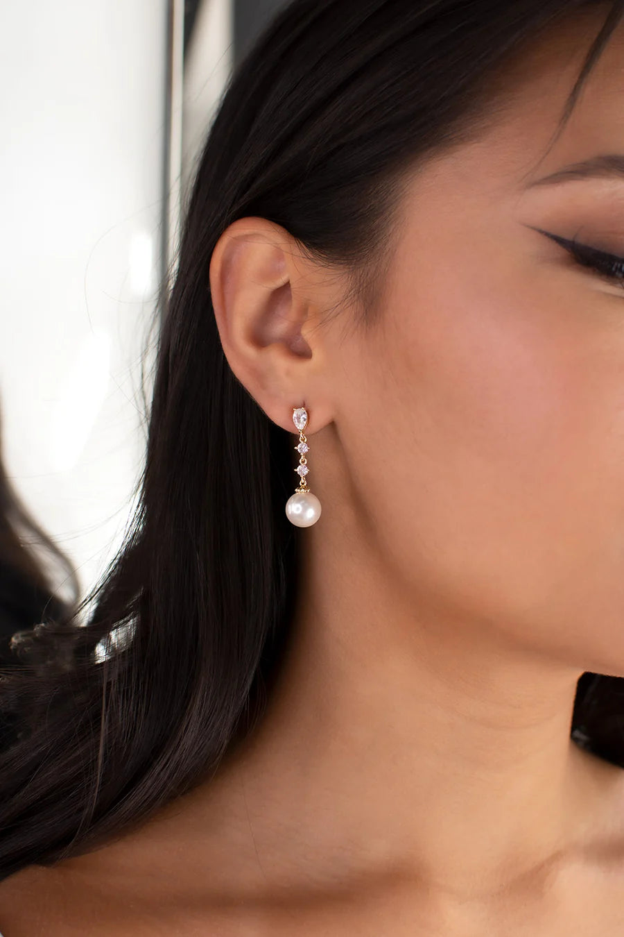 Brielle is a stunning long drop style earring. Circular stones fall from a teardrop crystal, featuring the length of the earring finished with a single beautiful pearl.