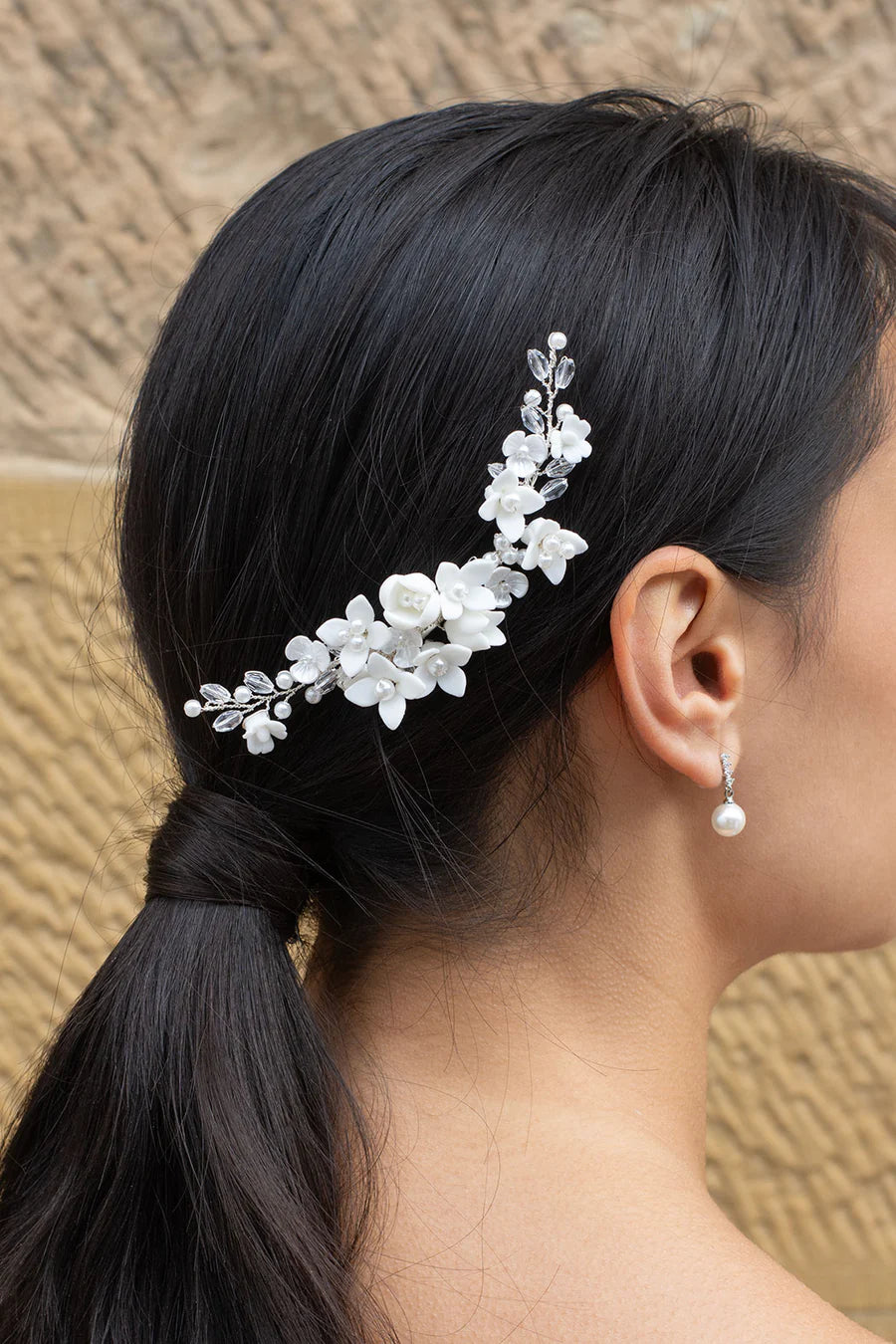 Adorn yourself with the most beautiful porcelain flowers with Callista. A breathtaking arch of intricate and delicate florals intertwined with pearl and sprigs of crystal. Incredibly lightweight and fixed with a strong clip, Callista sits pretty on top of a veil or at the back of a bun. Charming and elegant, Callista is the perfect bridal accessory for your big day.