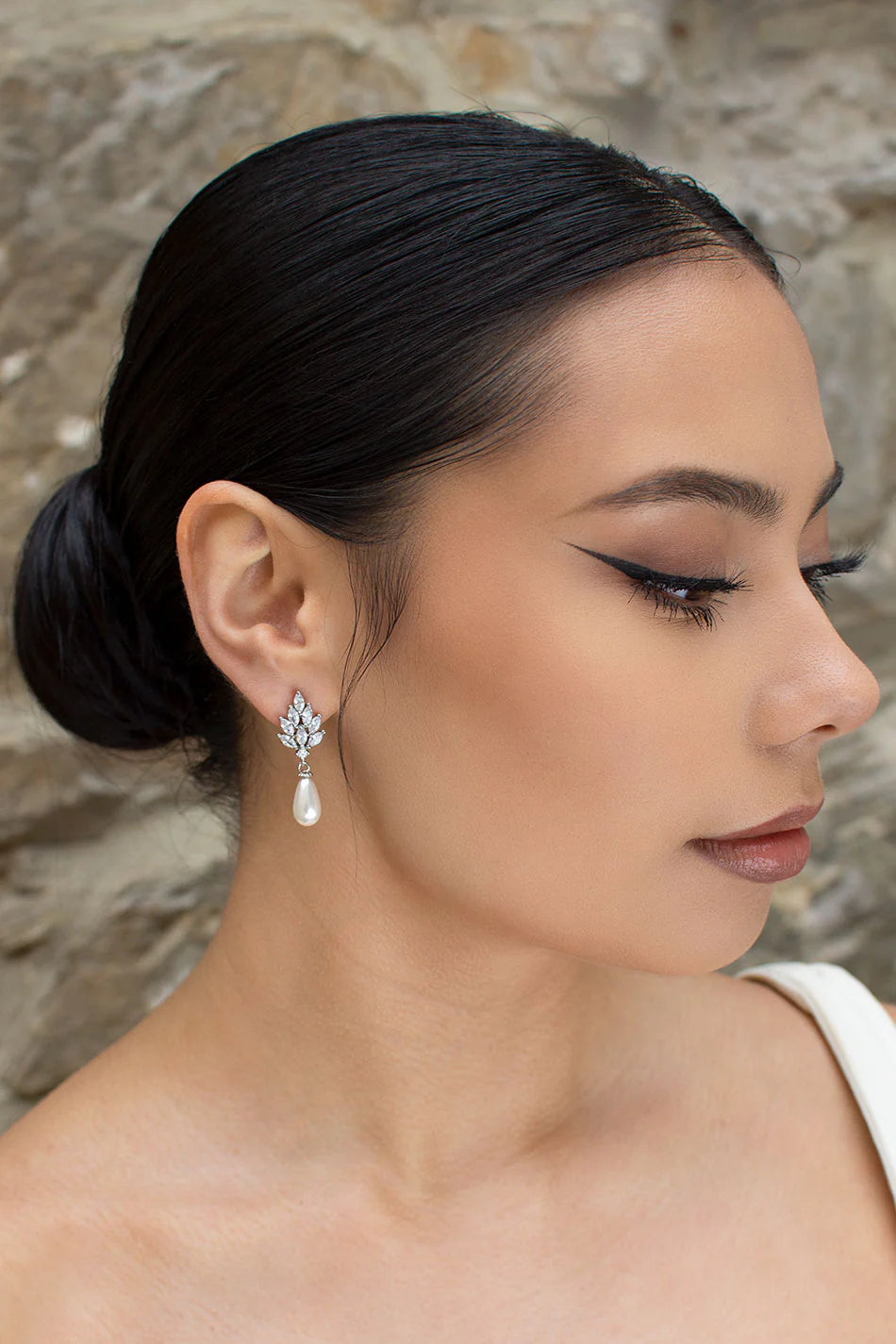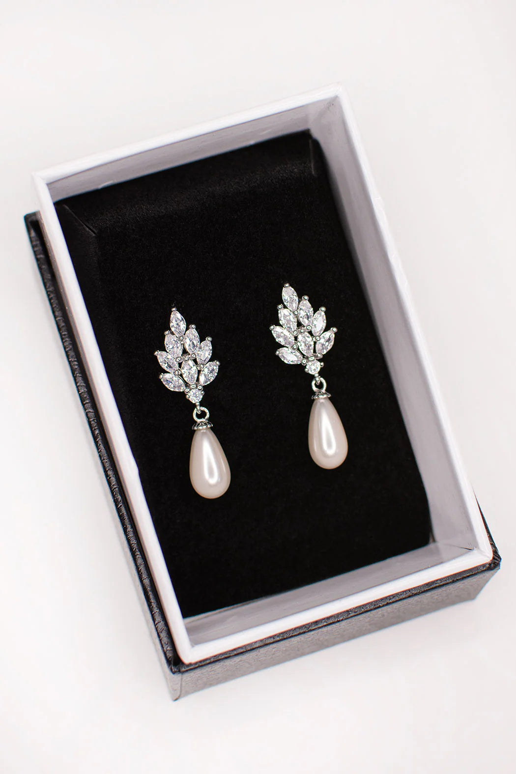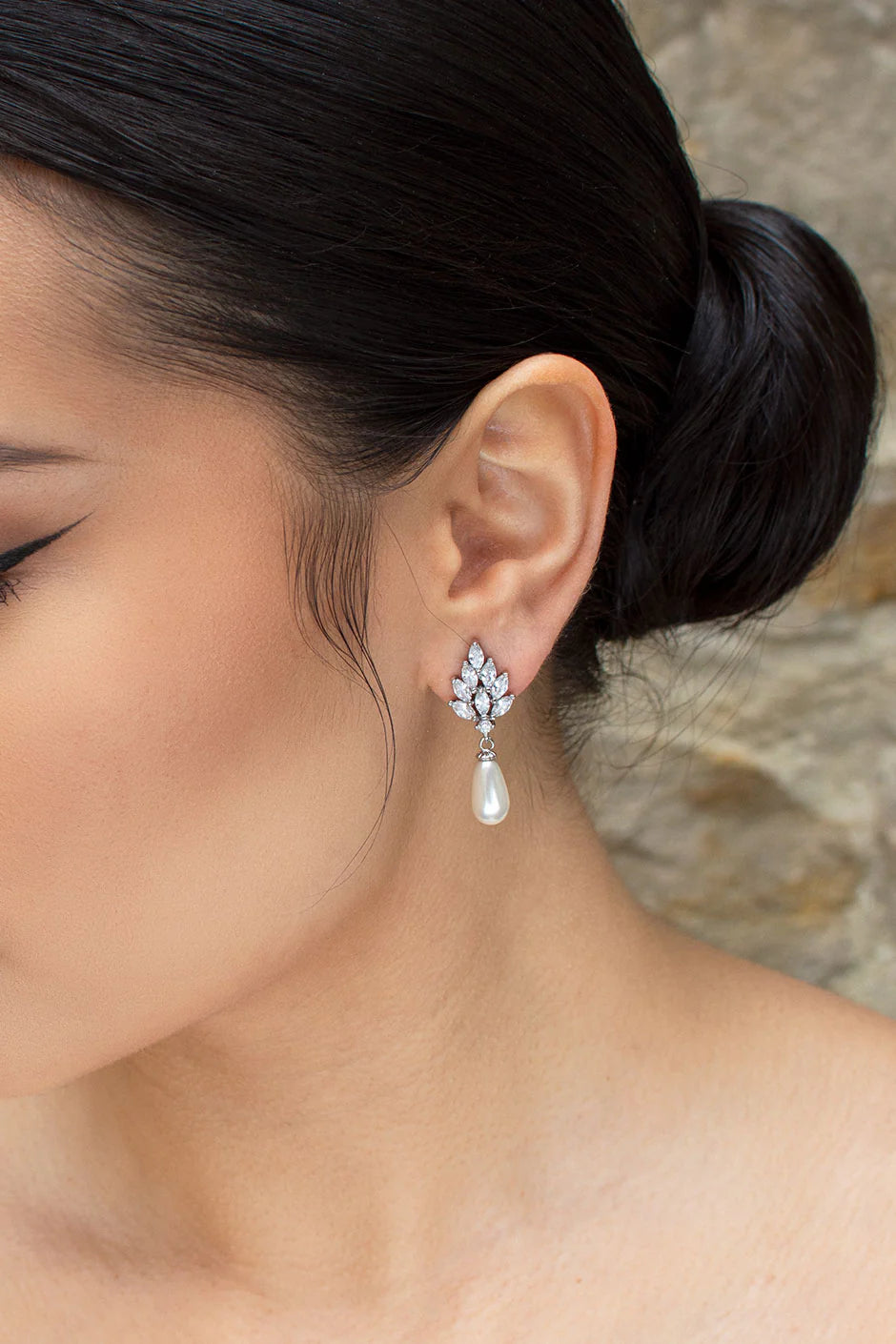 Held below Carla's symmetrical outstretching spiking design of tiny navette shaped stones is a single teardrop pearl that sways and dances elegantly with movement. Carla's simple yet eccentric design is a perfect choice for the Bride looking for that final touch of radiance to their bridal ensemble.