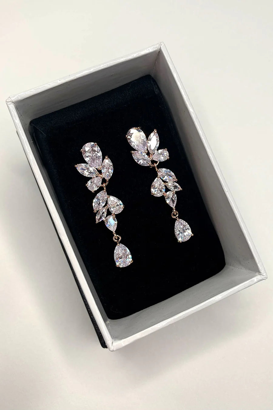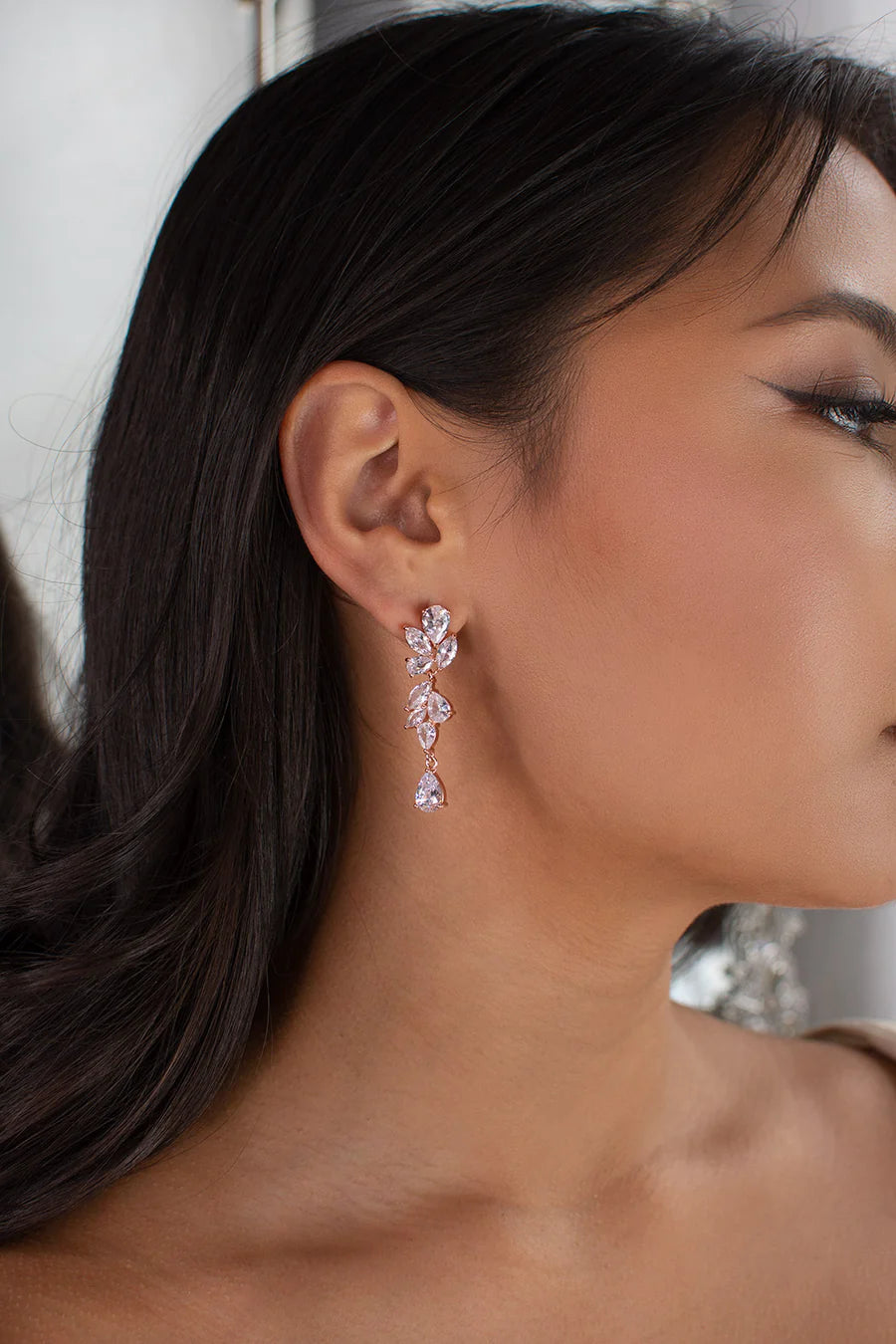 Claire is a fantastic etherial and fairy-like earring, made of clusters of teardrop and navette stones. The clear zirconias dance in the light and are exquisitely framed by pale rose gold tones. A short version of our long Claudia earring, Claire is a gorgeous rose gold mid-length earring with post fittings. Dance all night in these light catchers, they are sure to catch the eyes of many.