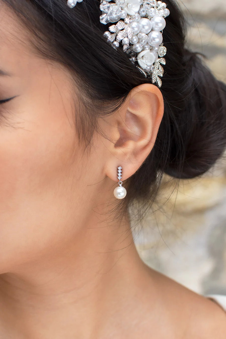 Simple yet stunning, Colette is a classic pearl drop earring featuring three quality crystals set in a rhodium silver finish attached to the post fitting. Colette is the perfect small drop earring that will complete and compliment any bridal outfit.