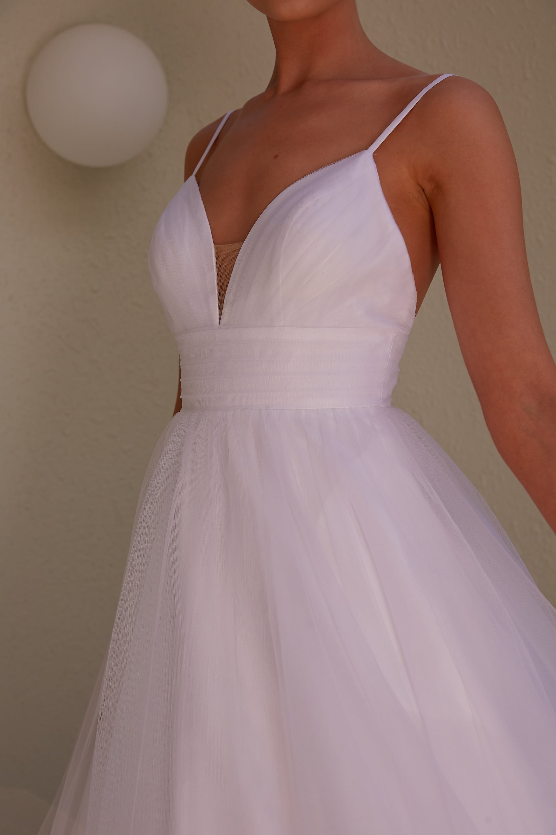 Crafted from delicate tulle, this dress showcases a graceful and understated beauty. The bodice features a mesh-inserted V-front neckline, adding a touch of modern flair, while a high waistband gracefully follows through to a low back, creating a captivating silhouette.