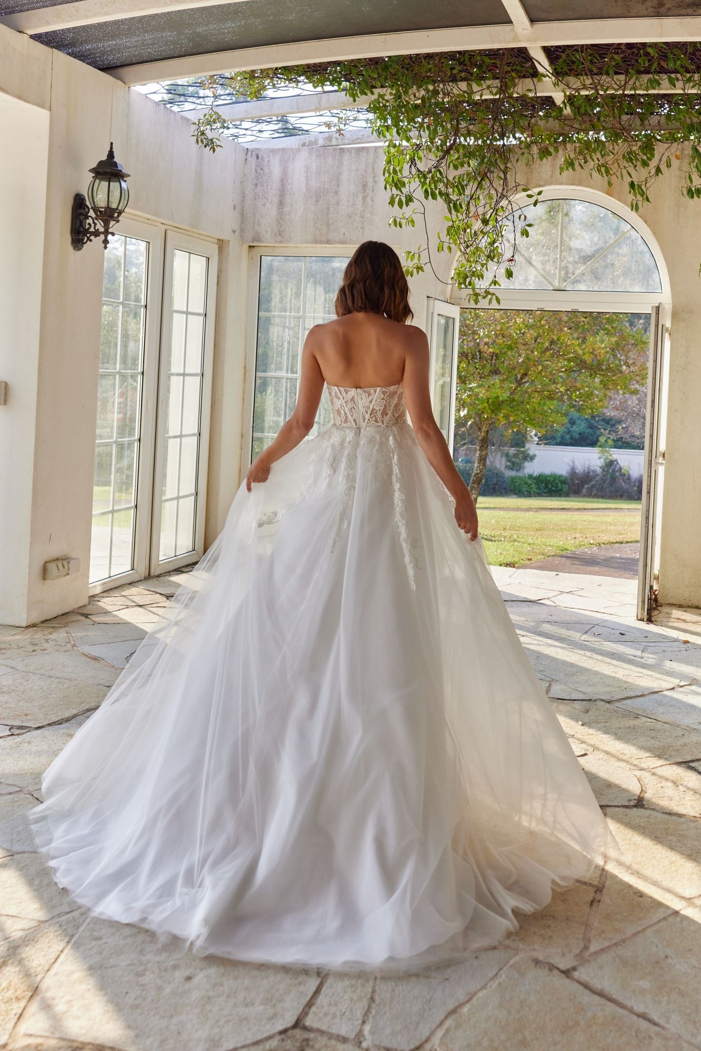 The Felicity Bridal Dress is a sleeveless gown, with a structured, embroidered bodice and a flowing a-line tulle skirt. Available for order in sizes 4-30.