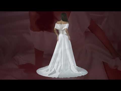 The Harper gown by Justin Alexander Bridal is a mikado satin A-line gown featuring a wide off the shoulder cuff accented with pleating on the front. Asymmetric pleating on the skirt flatters the figure and leads to a leg slit. She is finished with side seam pockets and satin covered buttons to the end of chapel length train.