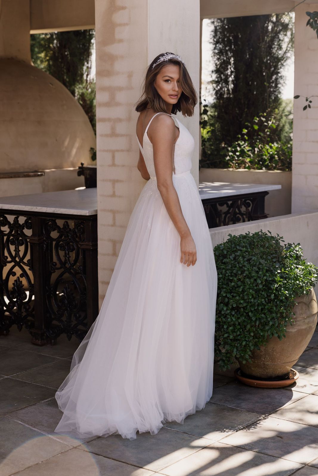 The Kiri bridal gown commands attention in any room. Layers of soft tulle and stunning lace have been thoughtfully draped to hang off the body and float through the air as you move. A delicate layer of shimmering beadwork peeks out from underneath sheer tulle. Featuring a thin waistband, mesh panels and an ultra-high leg split, Kiri is true modern sophistication. The Kiri is available in Vintage White in AU sizes 2-30.