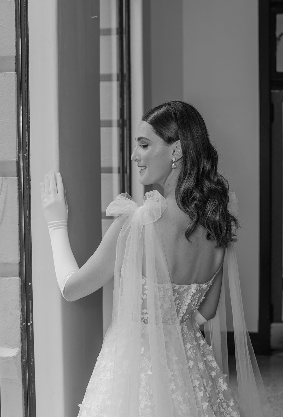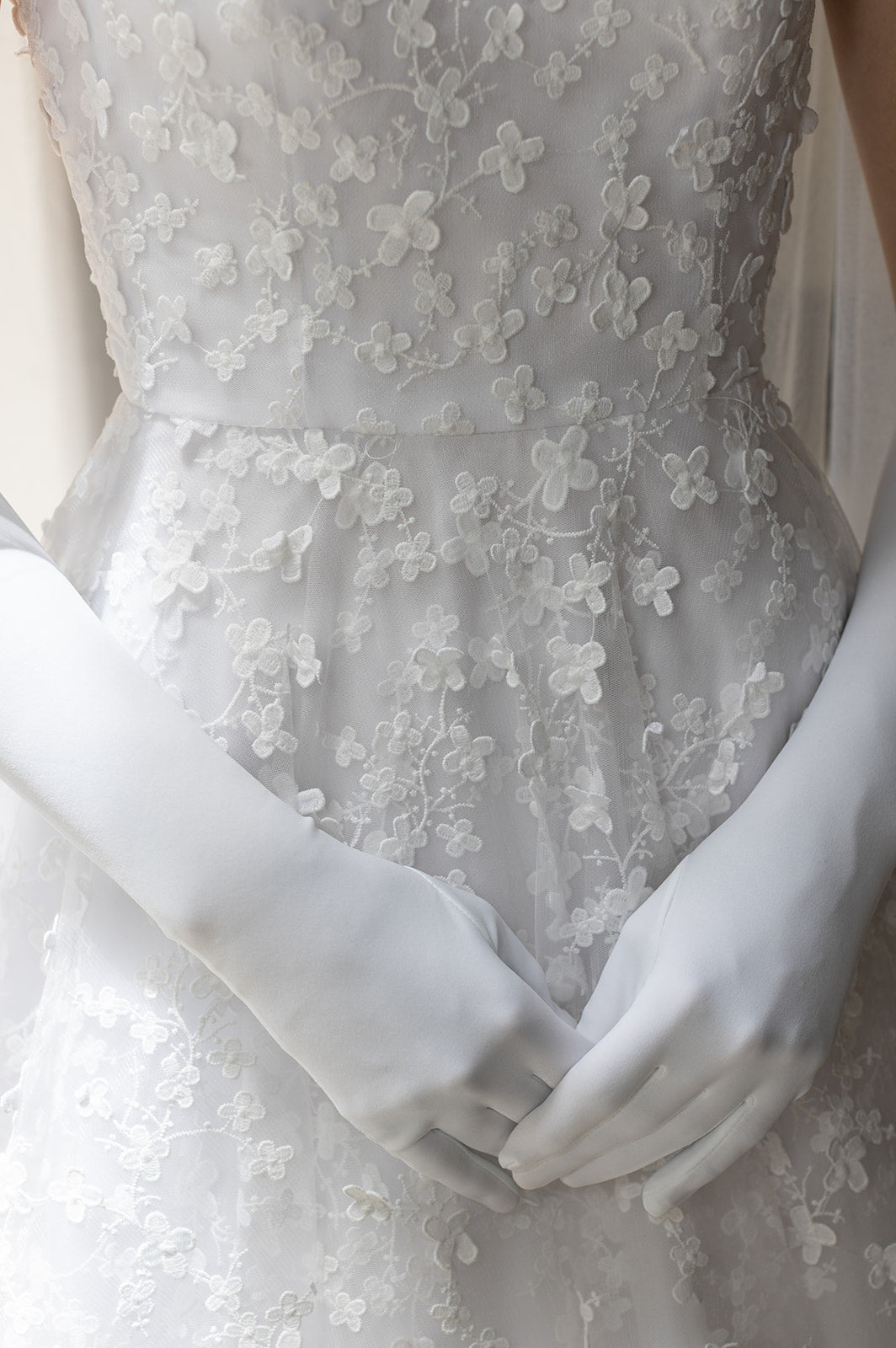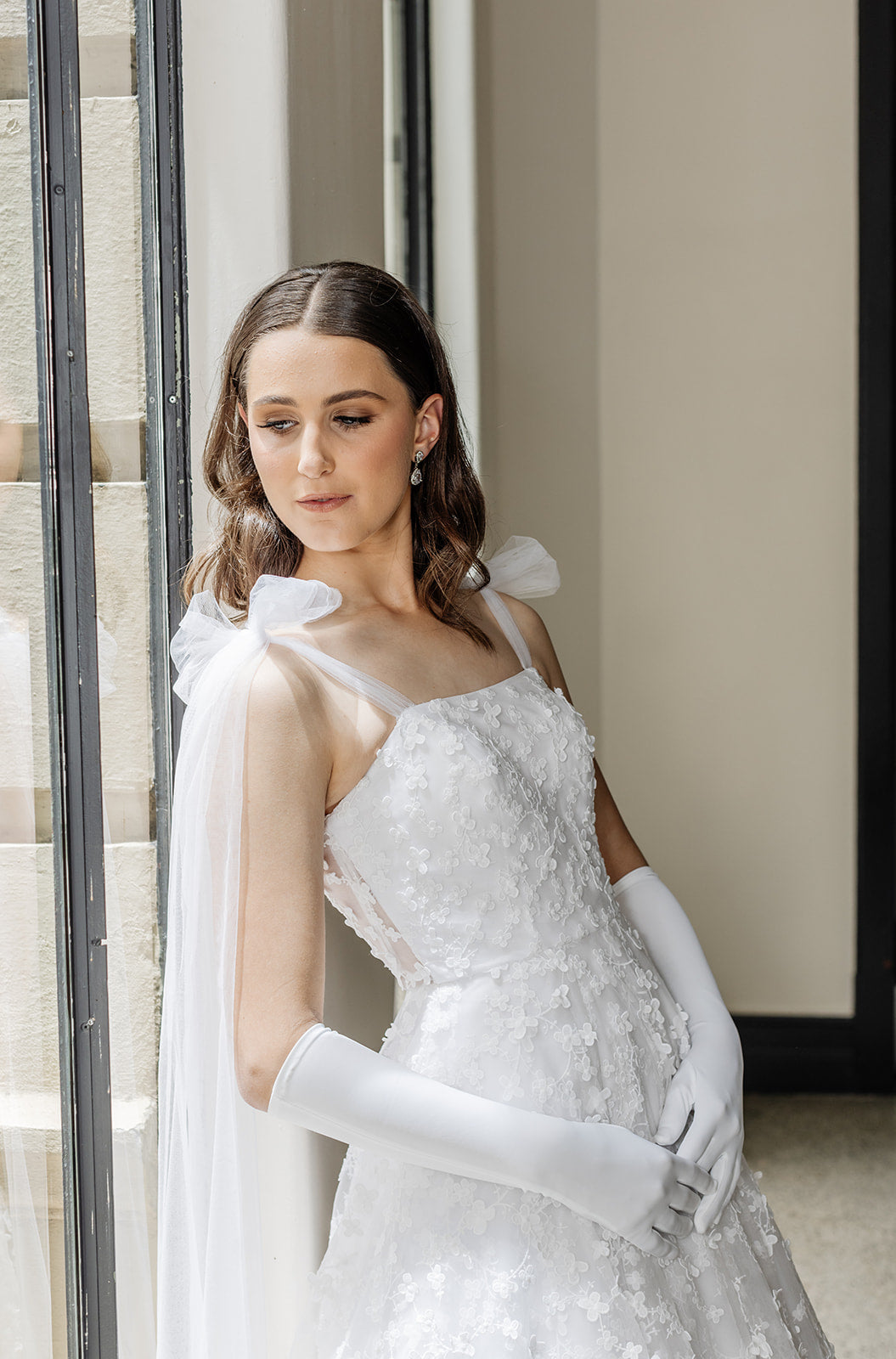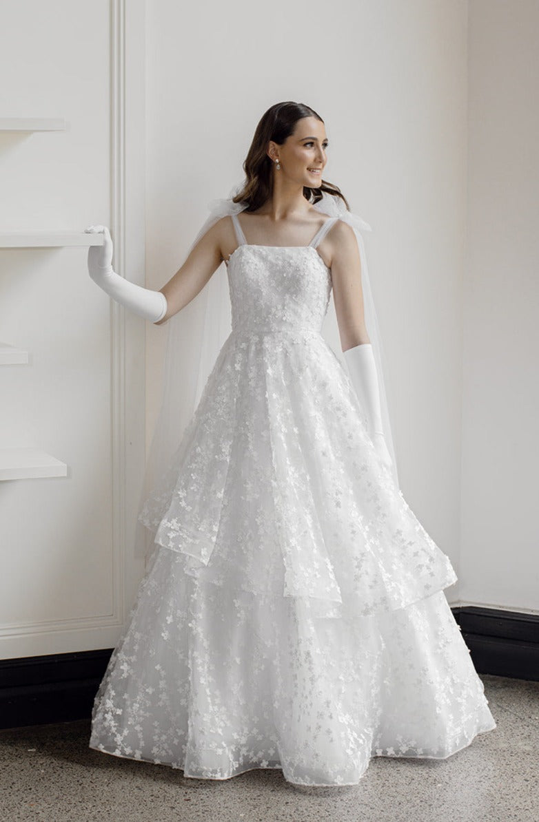 Delicate floral embellishments dot the whole dress for a modern and fun look. A modest square neckline and statement tulle bow straps complete the fitted bodice, which flares into a layered skirt perfect for dancing. The back is finished with an invisible zip and button details.