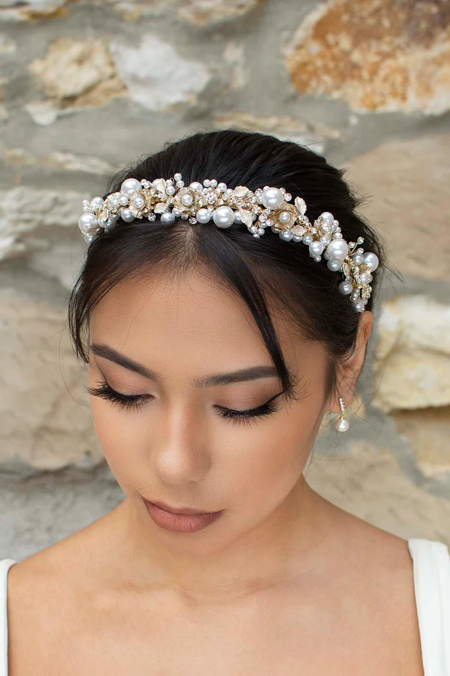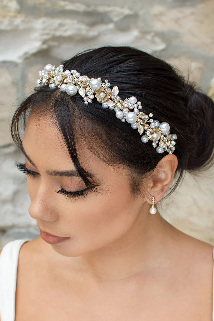 Wondrous Stella, an amazing Gold Pearl Headband that illuminates the room. Feel like the most exquisite bride wearing a piece that has been handcrafted with lustrous pearls and dazzling crystal stones. With subtle flower motifs, Stella is like a charming garland of pearls and leaves made with intricate detail. Stella is perfect to wear for long periods of time, causing no pain or headaches due to its bendable nature. Soft and easy on the head, Stella is suitable for a range of bridal hairstyles. Be the bride you've always dreamed of being with Stella.