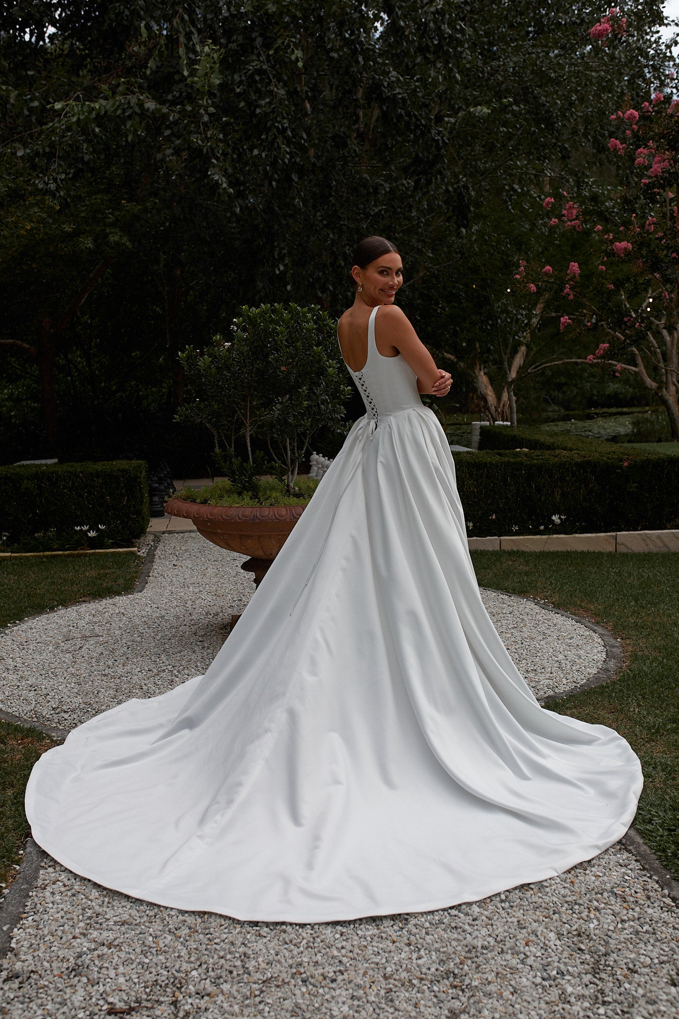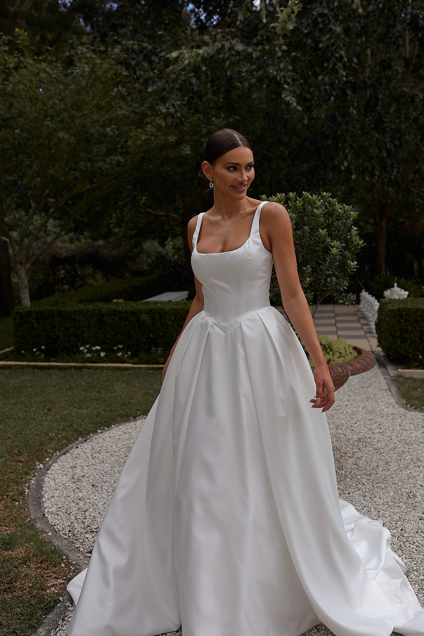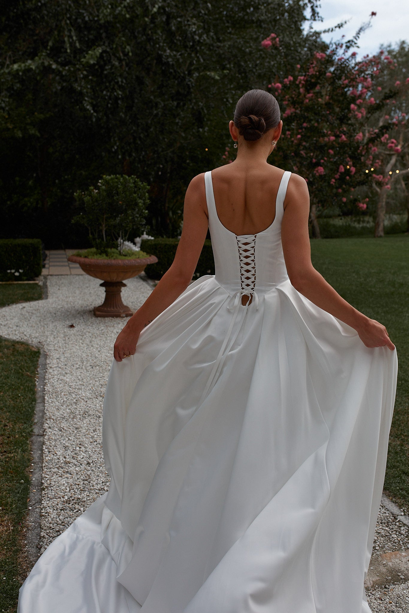 Crafted from luxurious satin in vintage white, Cicely is a vision of understated glamour.