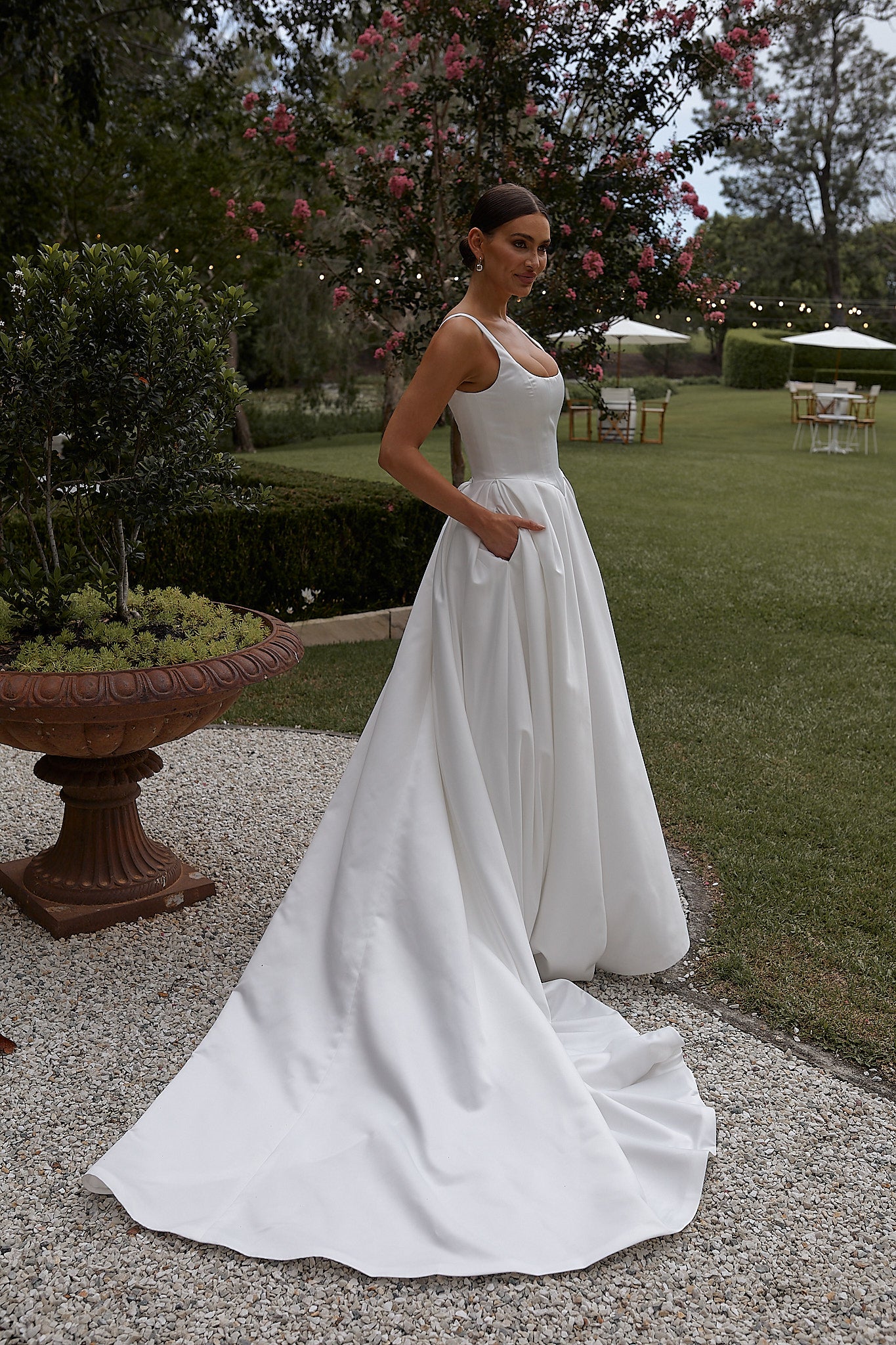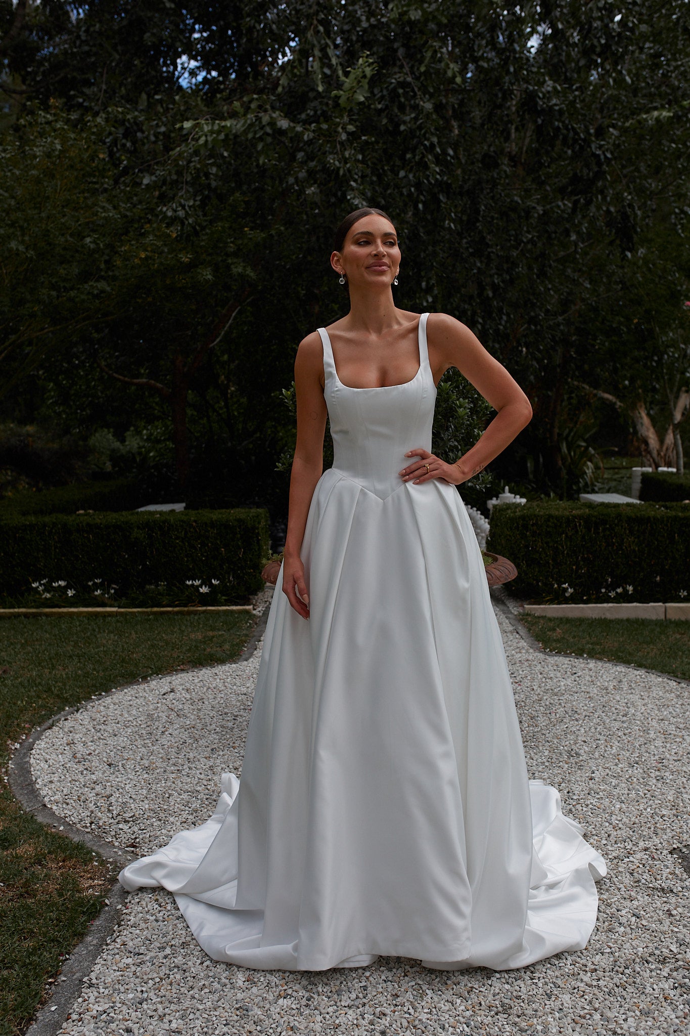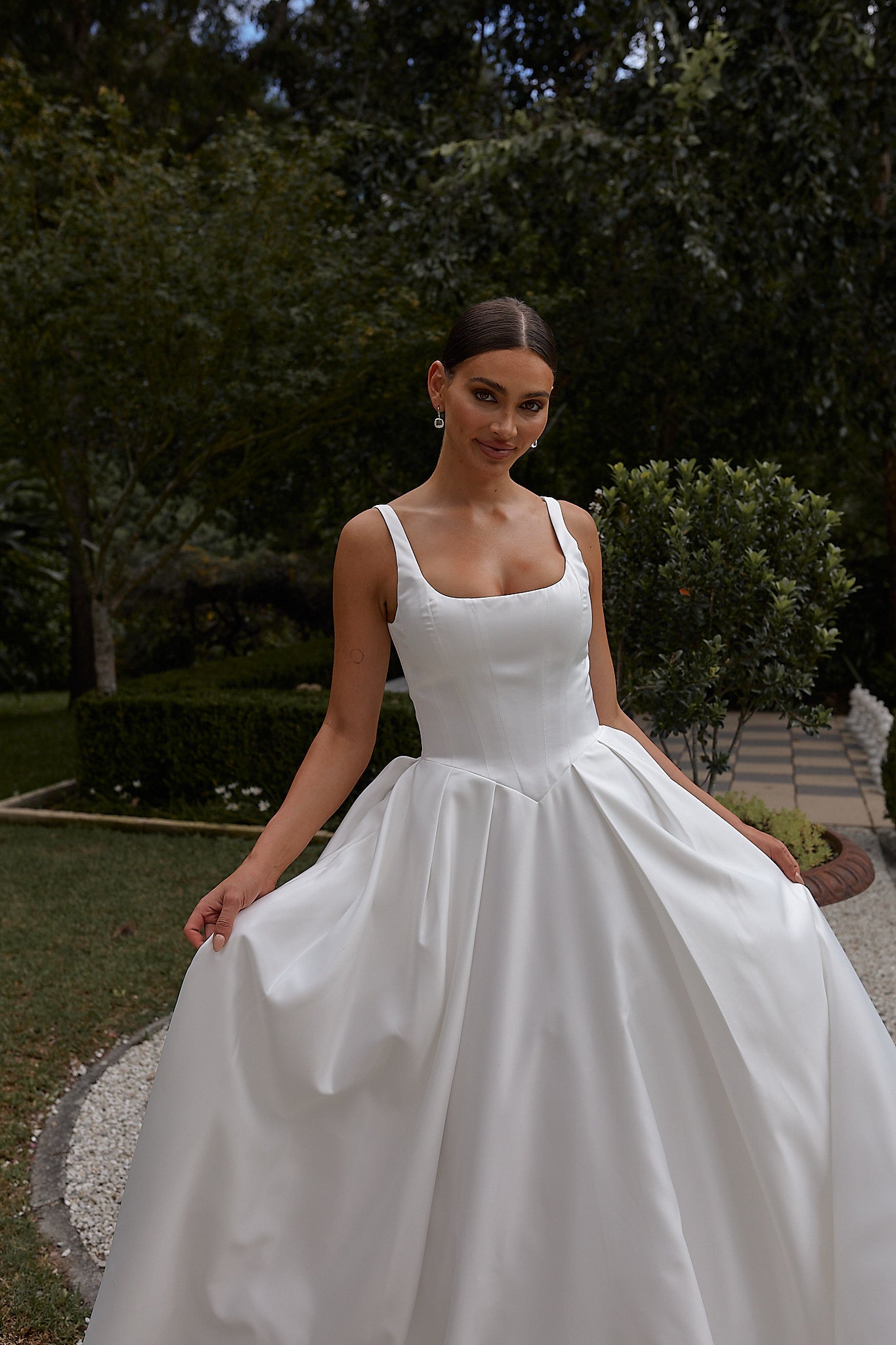 Crafted from luxurious satin in vintage white, Cicely is a vision of understated glamour.