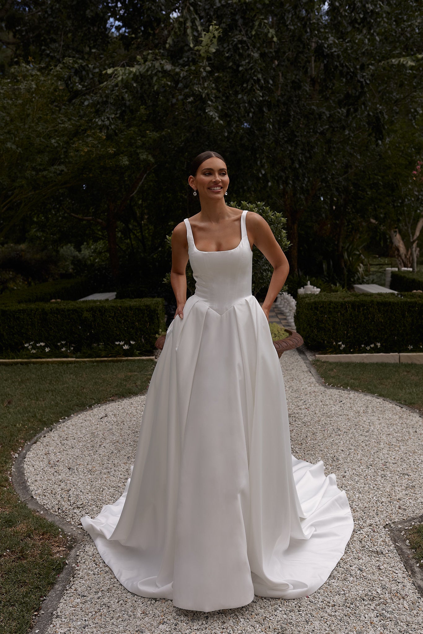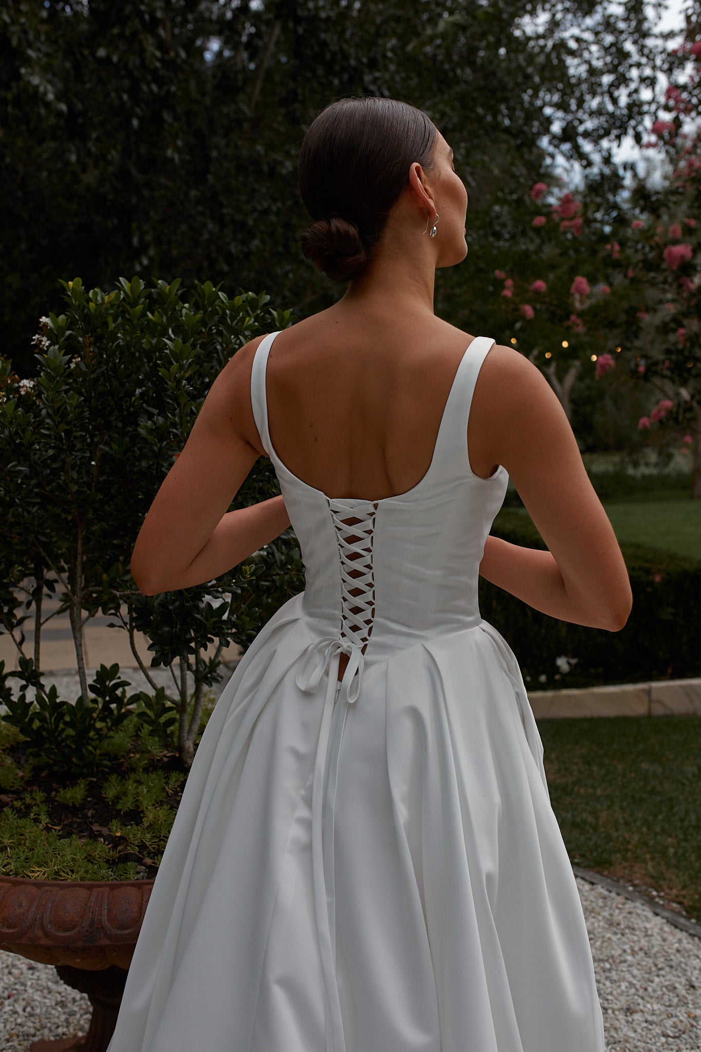 Designed for both style and comfort, Cicely features a modern square neckline with wide-set straps that offer extra support and the bodice is crafted with built-in bra cups, boning, and soft fusing to create impeccable construction, ensuring you feel confident and secure as you walk down the aisle. Cicely's modern drop V front waist design and lace up corset back creates a flattering silhouette and gives you more control over the bodice fit. Side seam pockets are a practical finishing touch.