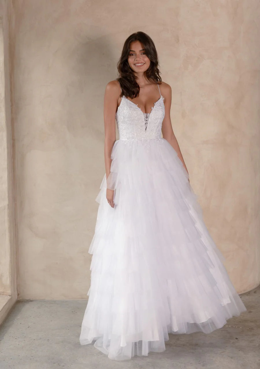 The gown flows into a tiered A-line skirt, complete with in-built structural frills, creating dramatic volume and movement with every step. An invisible back zip ensures a smooth and seamless closure.