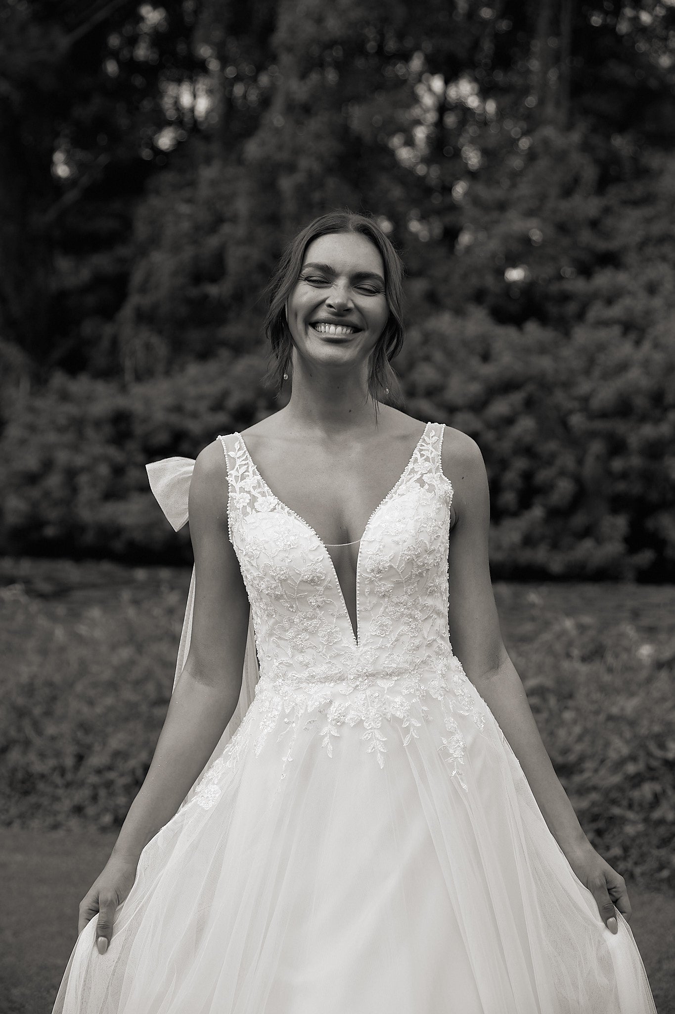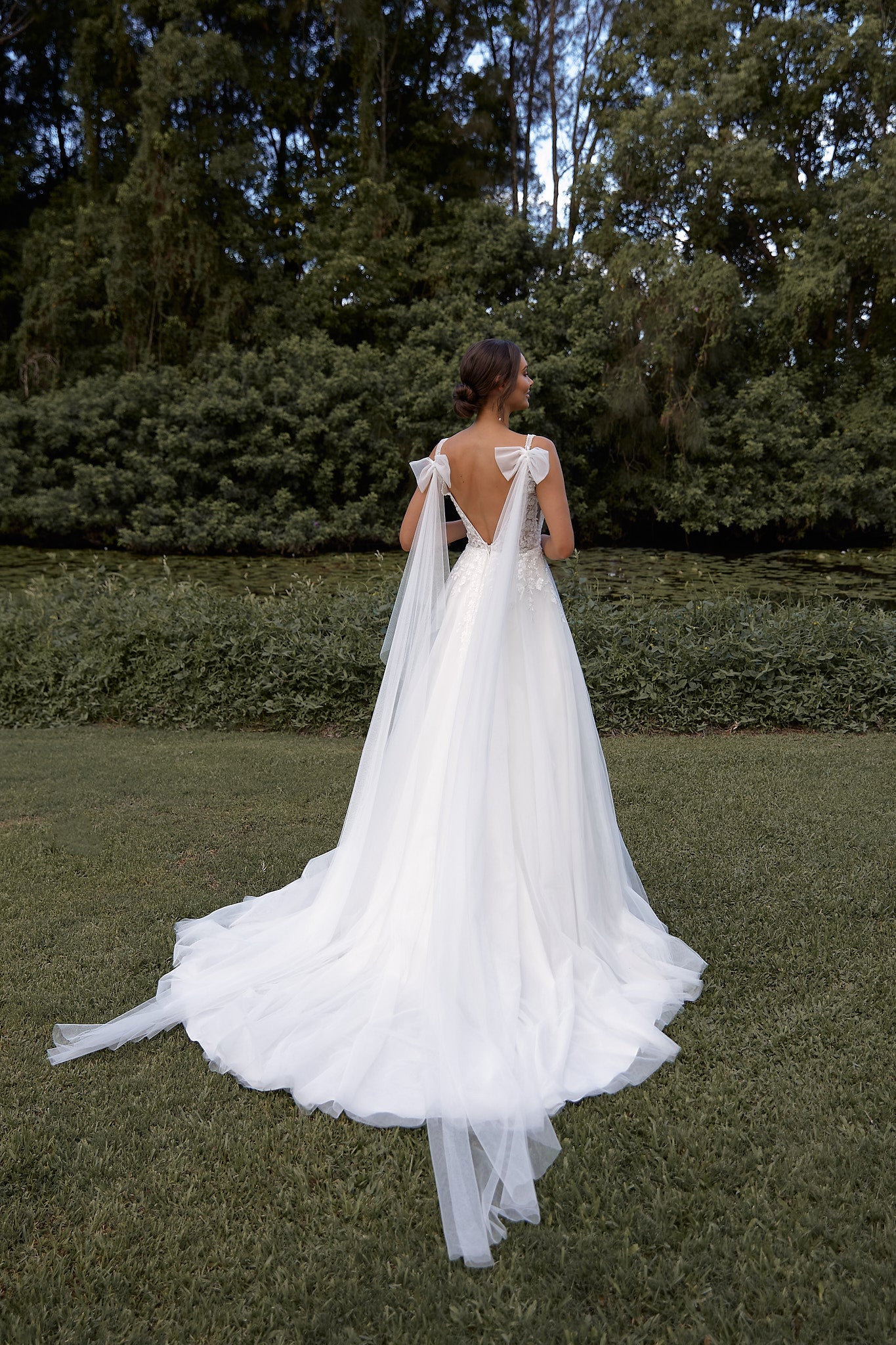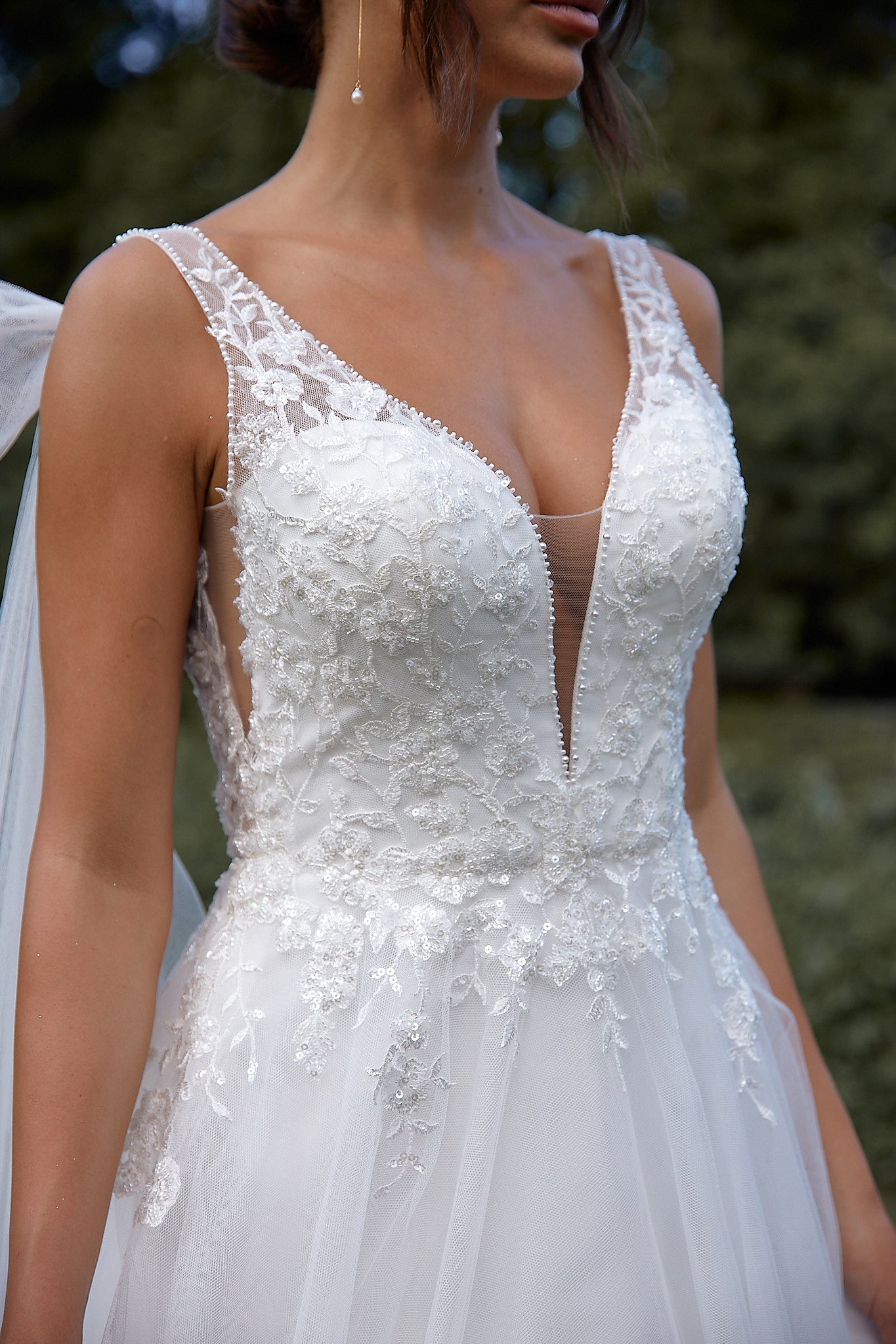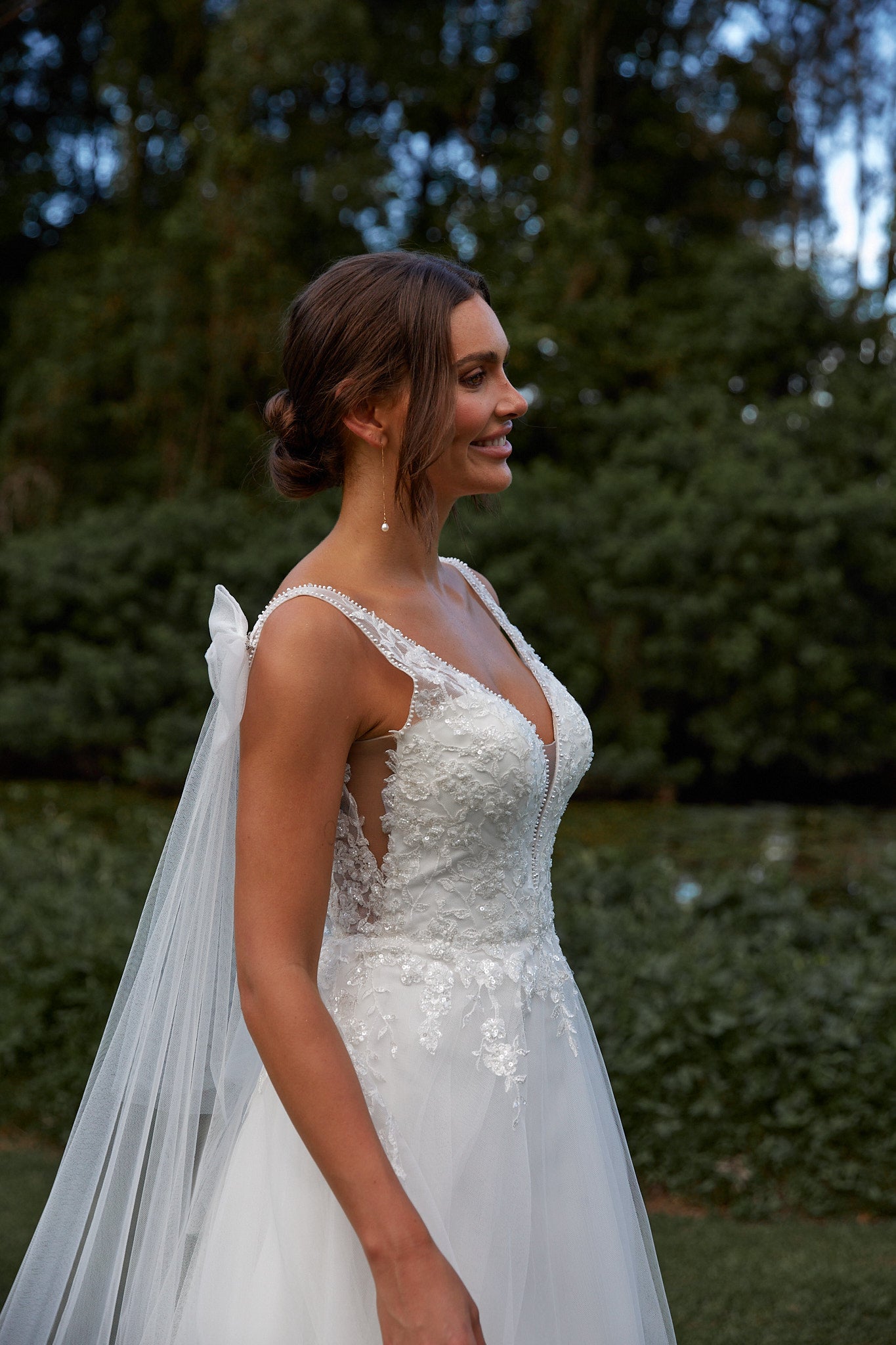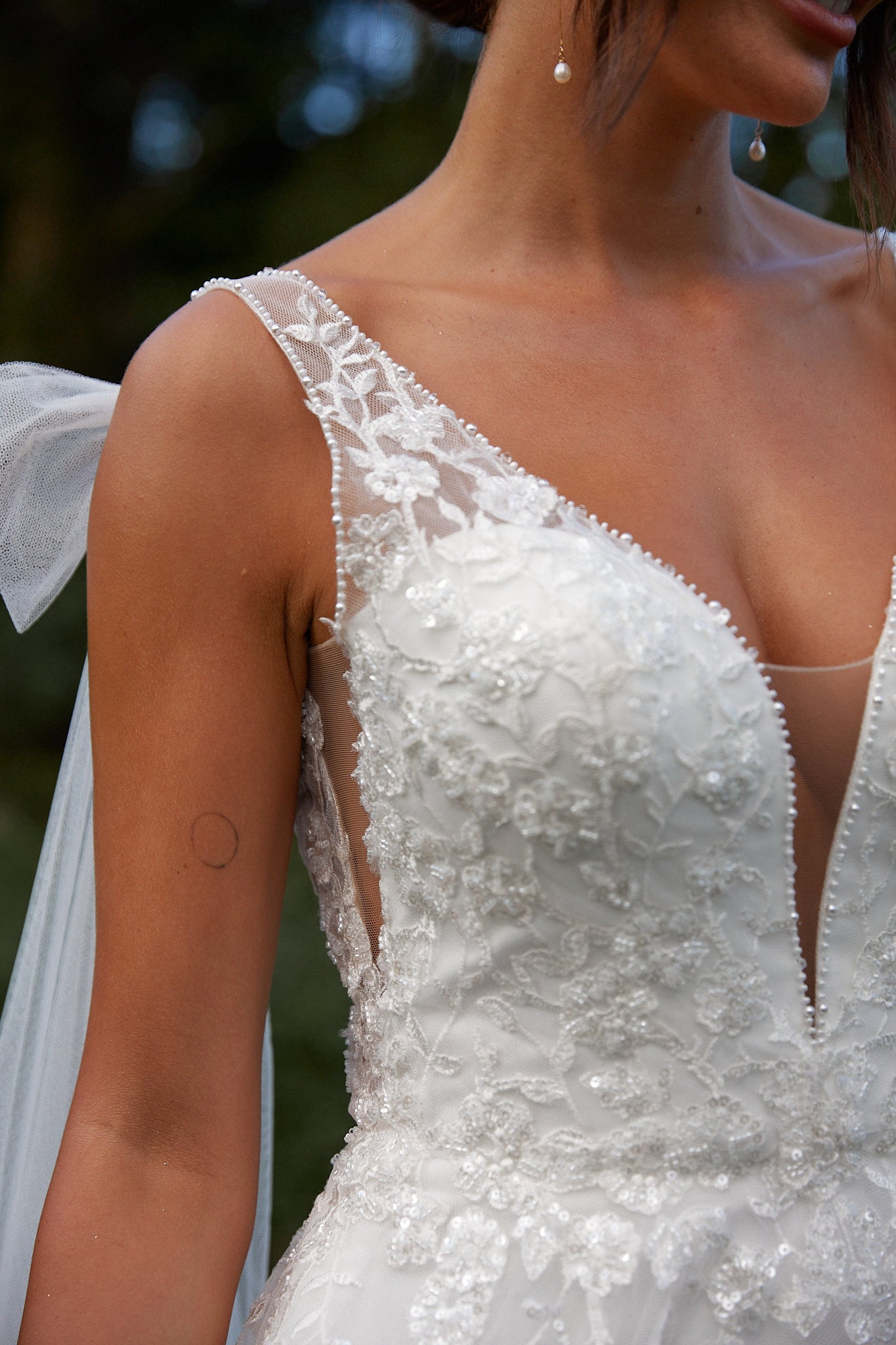Experience modern romance in Rosalba. This lace and tulle masterpiece boasts a plunging neckline with sheer lace, detachable back bows, and chic tulle side cutouts. With built-in support and a sultry plunging v-back, it ensures effortless elegance. Complete with an invisible zip, this floor-length A-line gown is available in Vintage White & Vintage White/Pink Rum lined options. Perfect for the bride who embodies contemporary sophistication with ease.