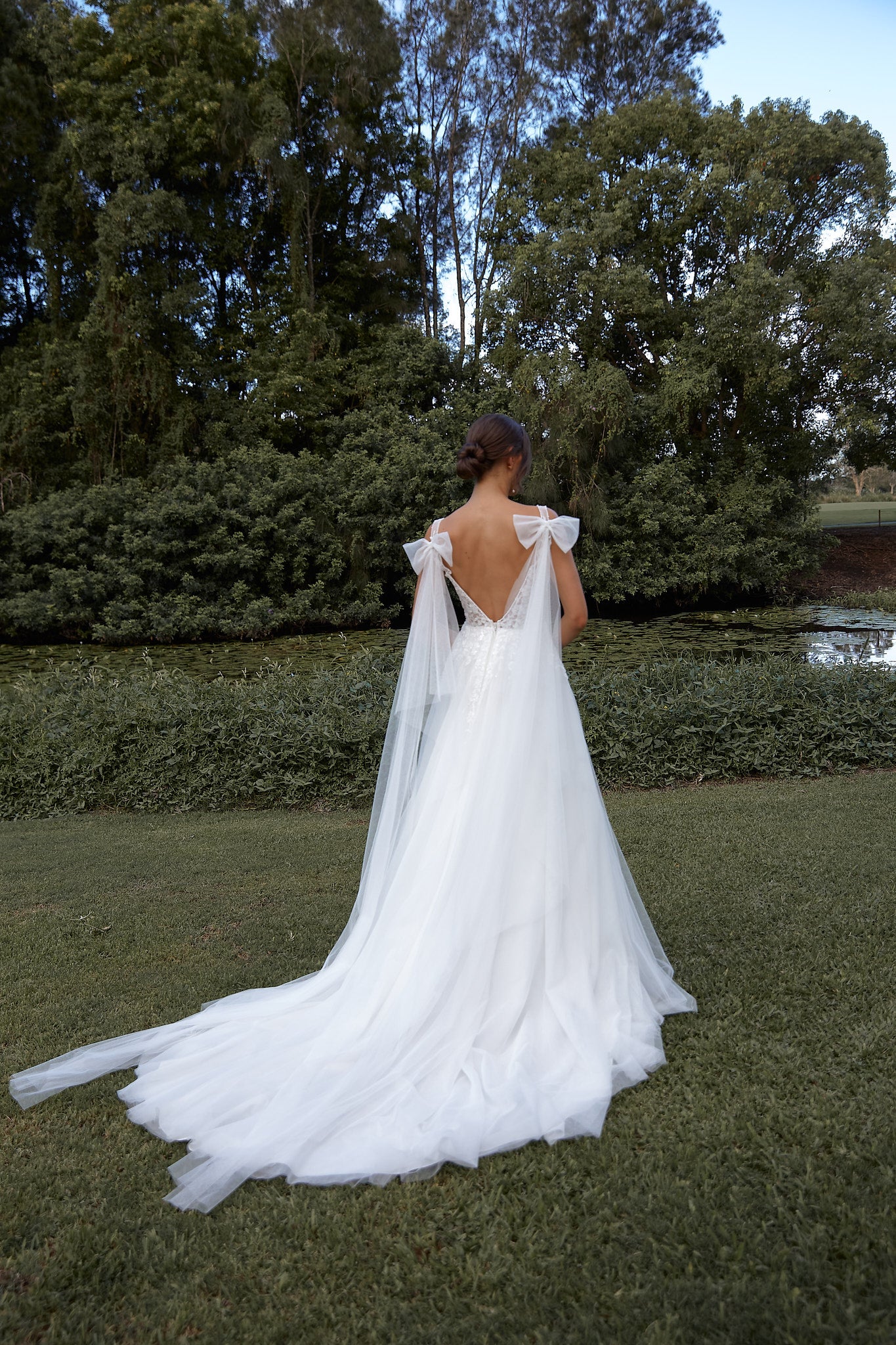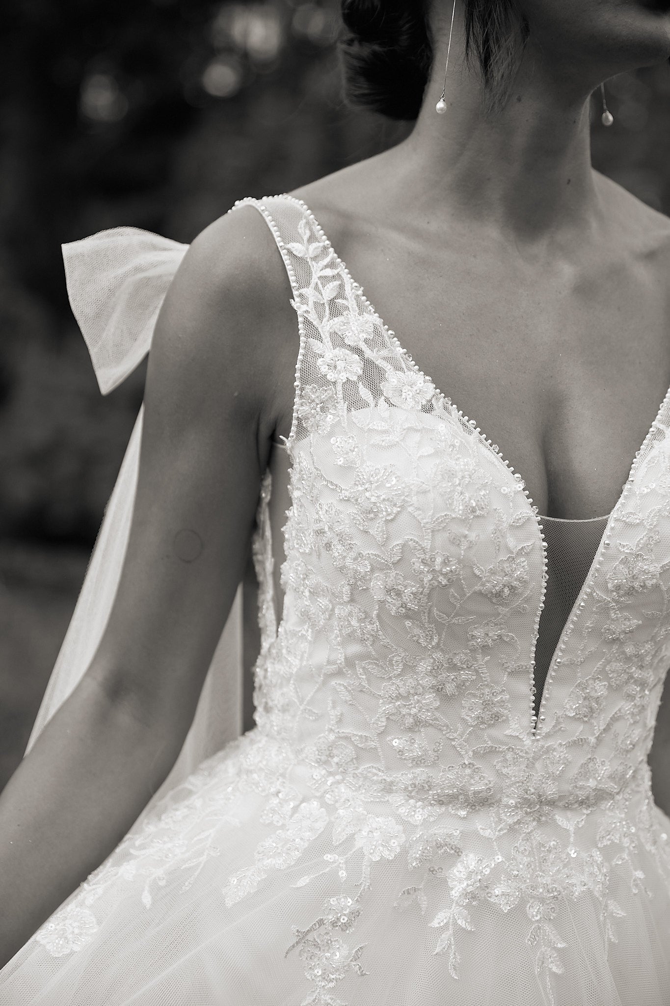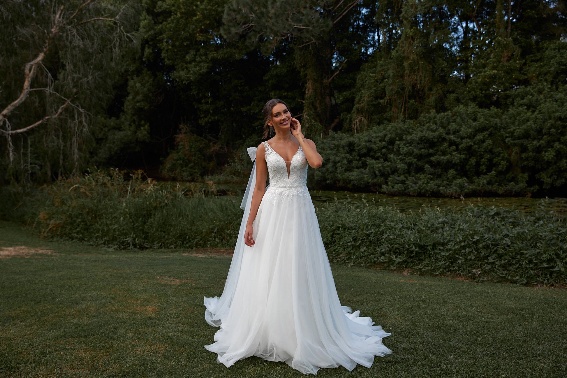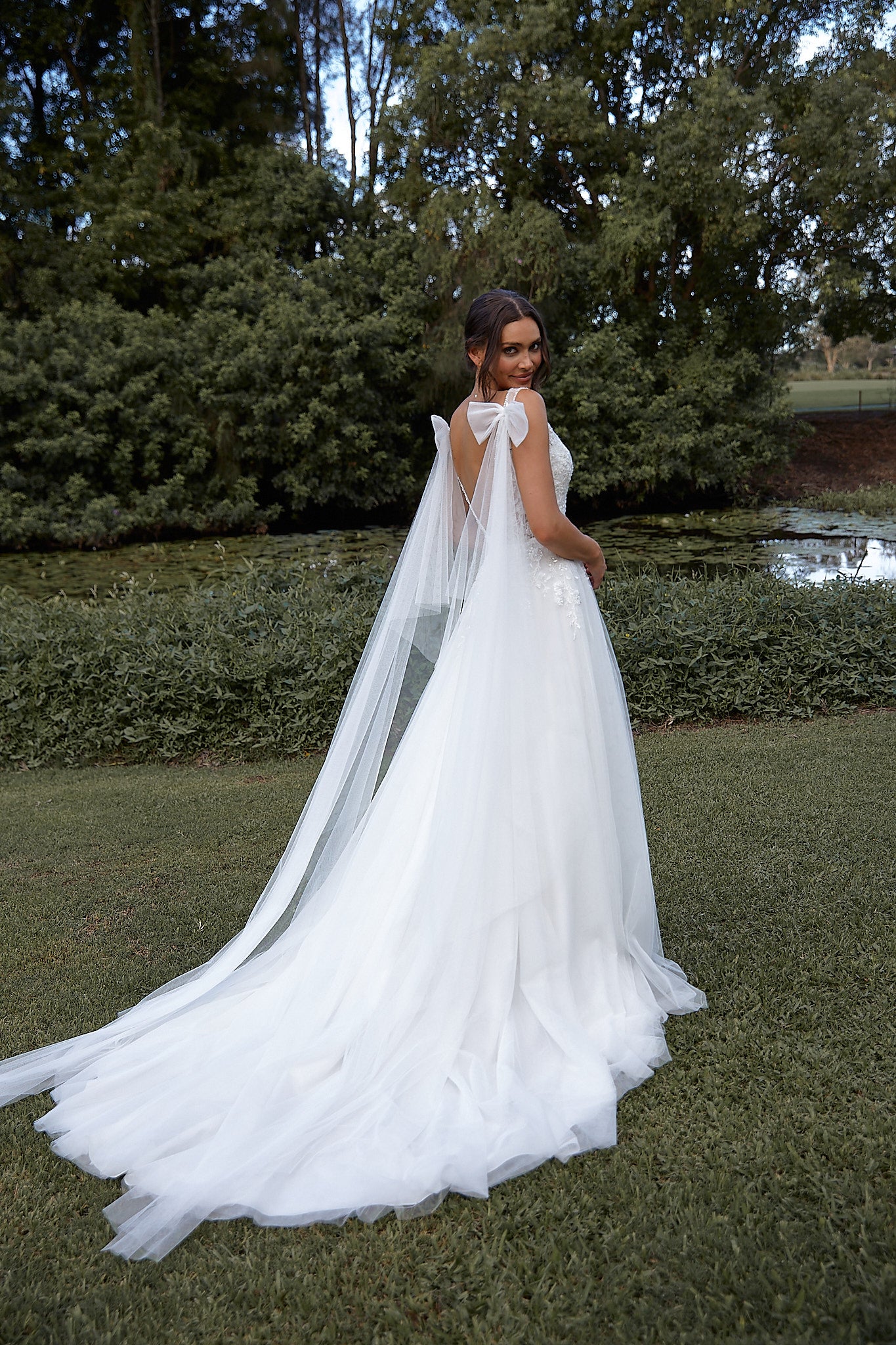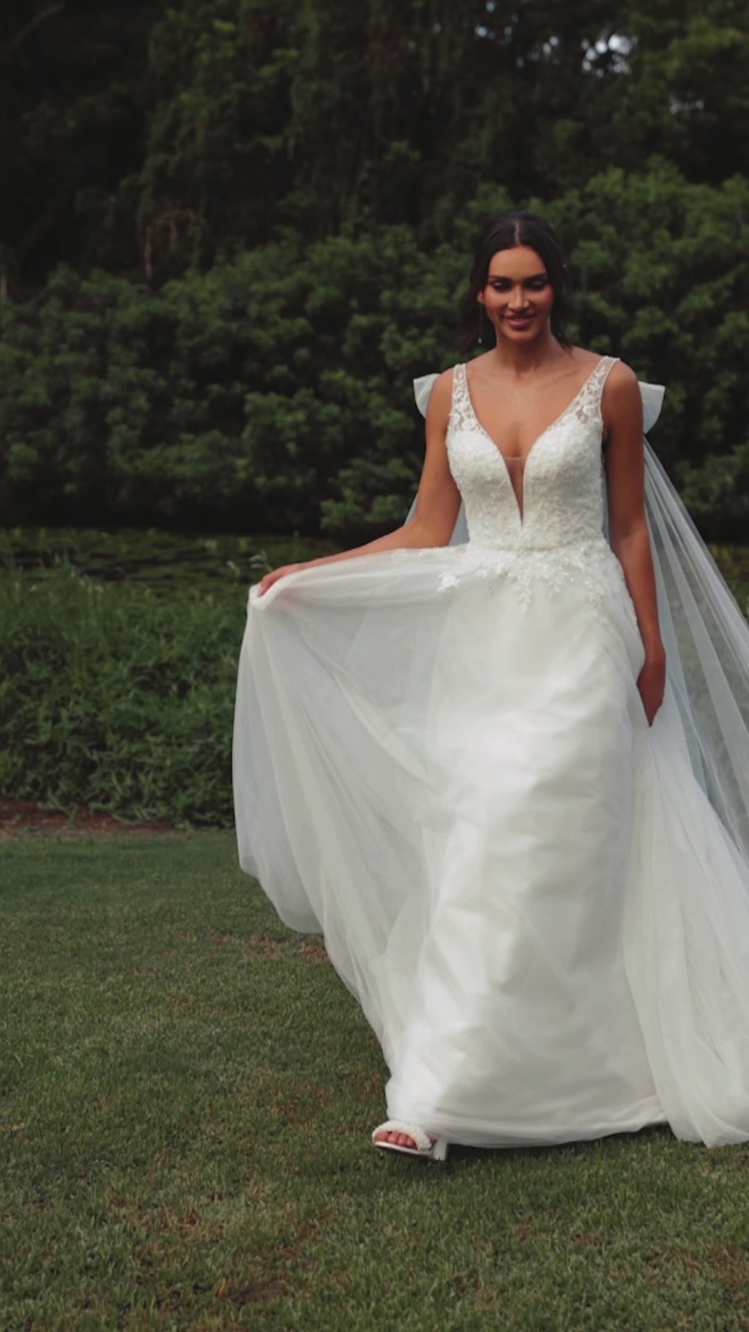 Experience modern romance in Rosalba. This lace and tulle masterpiece boasts a plunging neckline with sheer lace, detachable back bows, and chic tulle side cutouts. With built-in support and a sultry plunging v-back, it ensures effortless elegance. Complete with an invisible zip, this floor-length A-line gown is available in Vintage White & Vintage White/Pink Rum lined options. Perfect for the bride who embodies contemporary sophistication with ease.