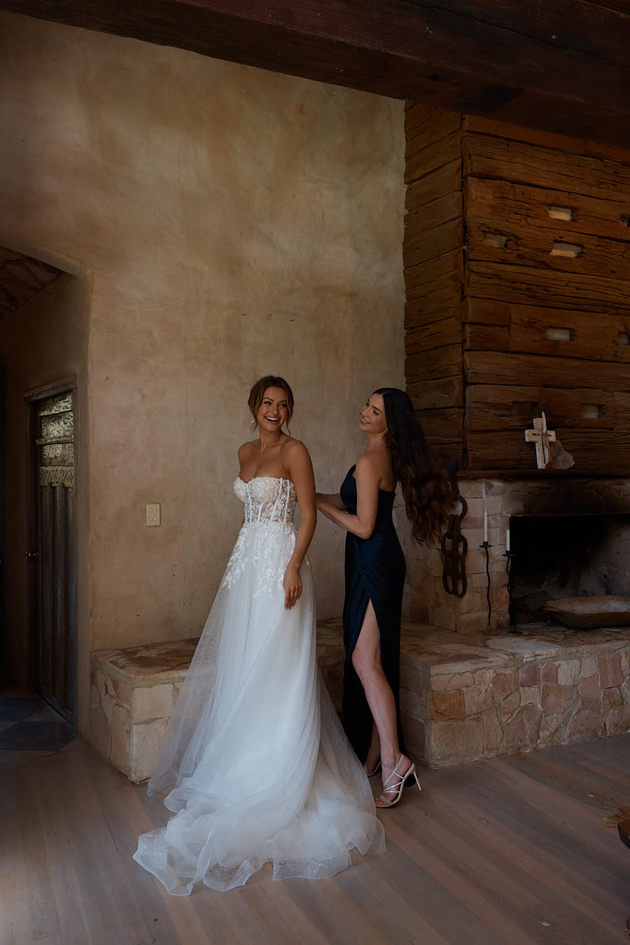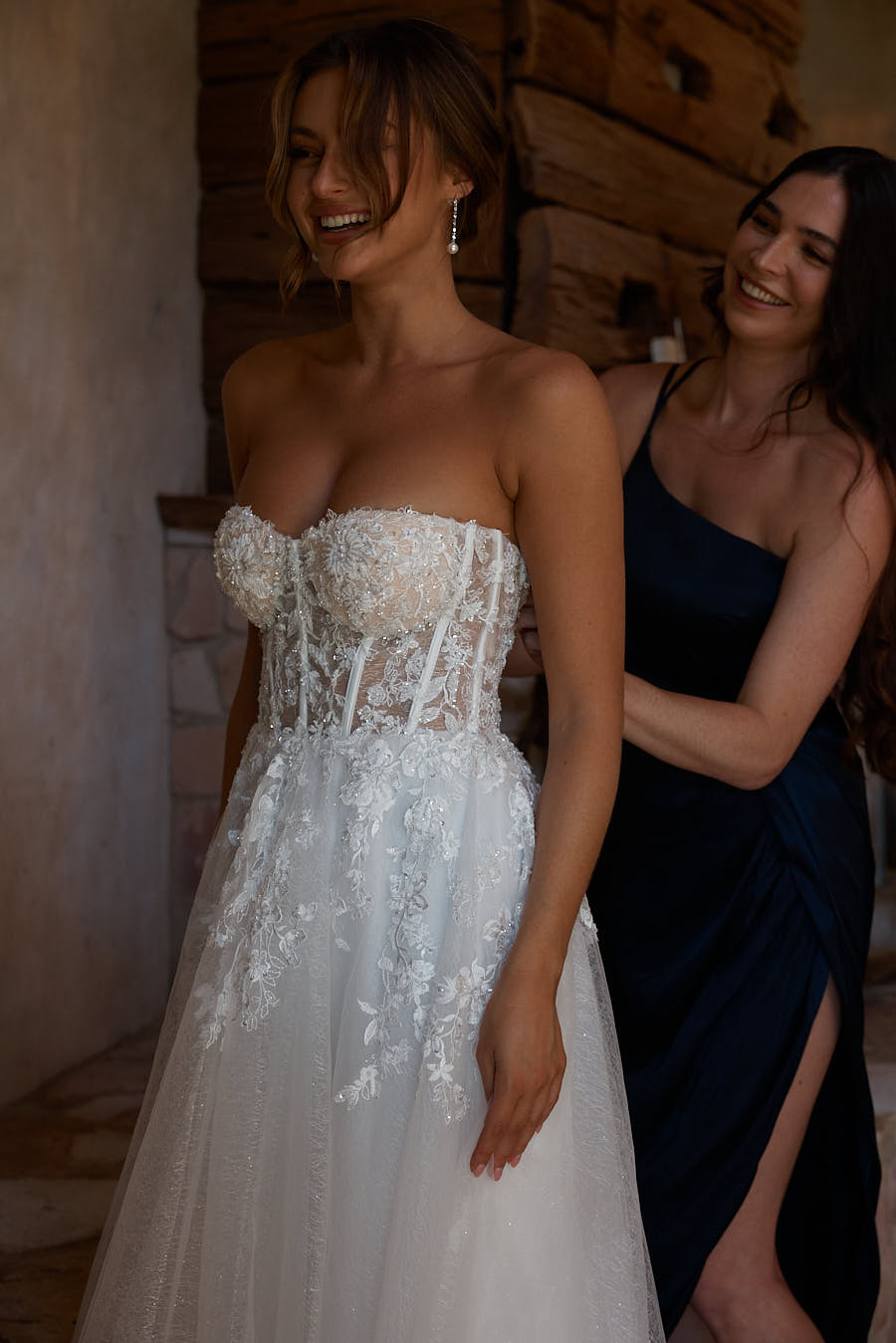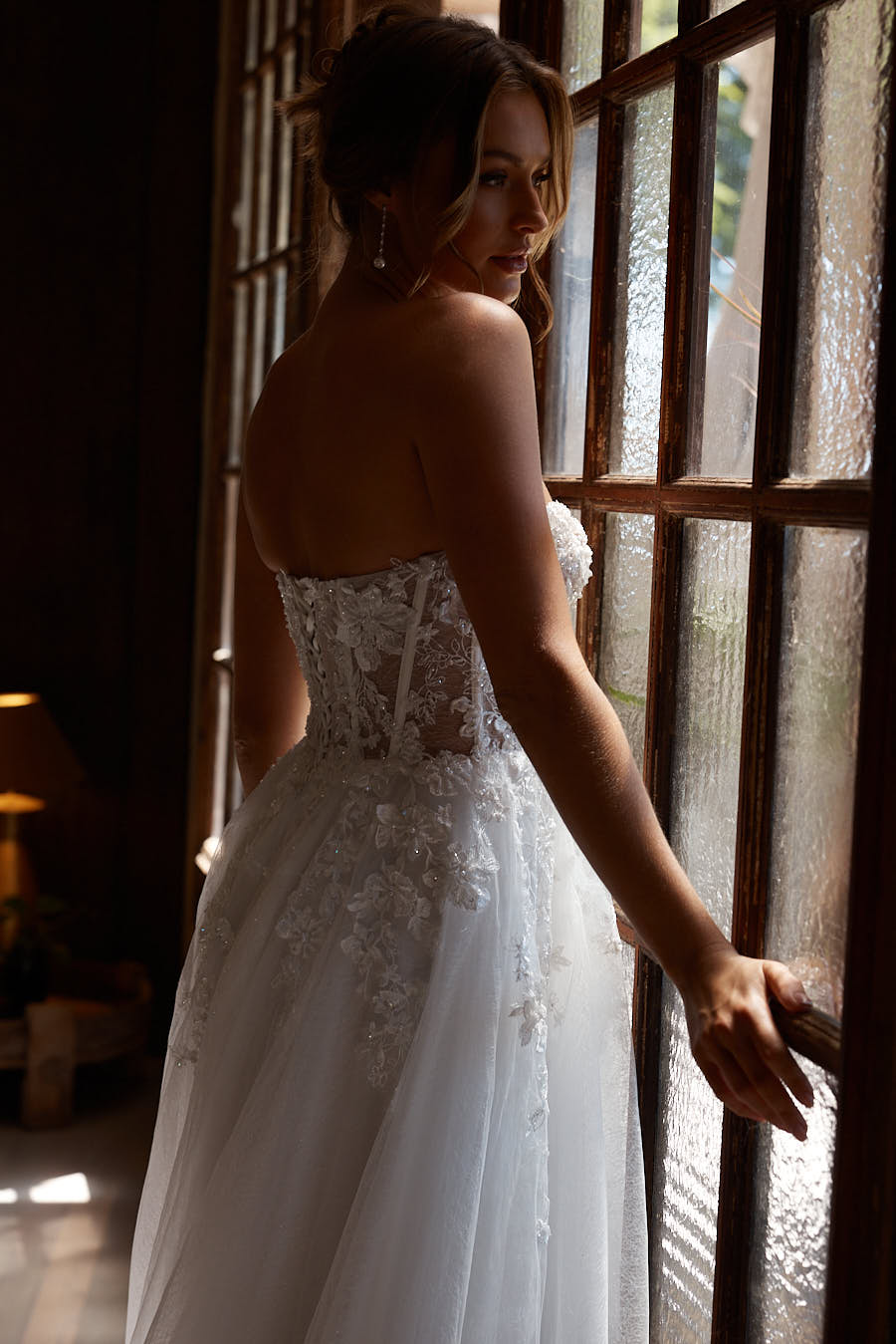 This dress is designed with the utmost care and attention to detail. The inner nude bra cups and exposed boning provide support and shape to the bodice, while the skirt is fully lined for added comfort. The Maia TC2335 dress is made from the finest quality materials and is constructed to the highest standards to ensure that it will be a cherished part of your wedding day memories for years to come.