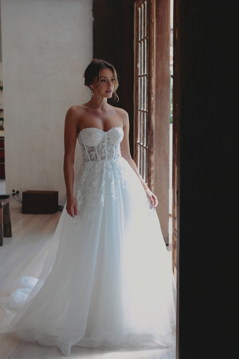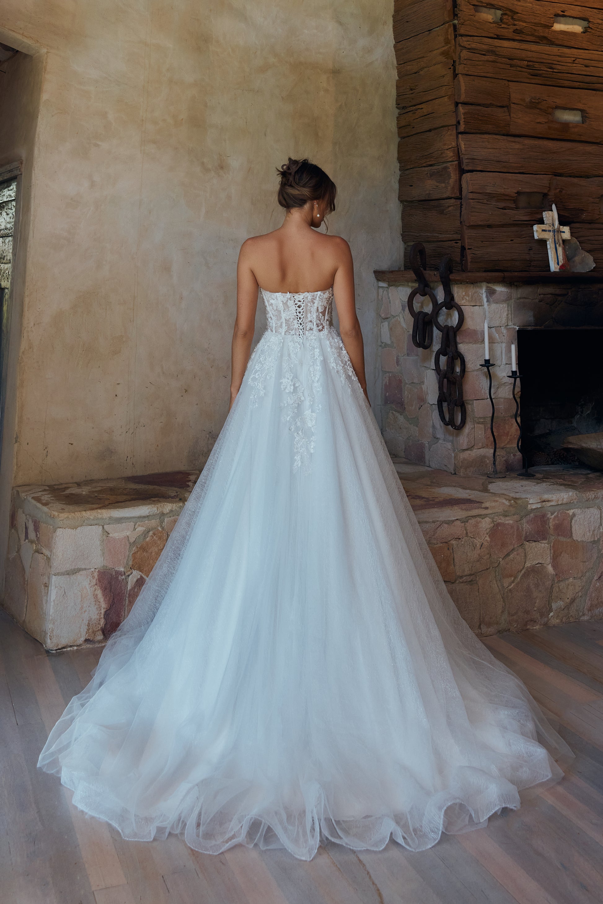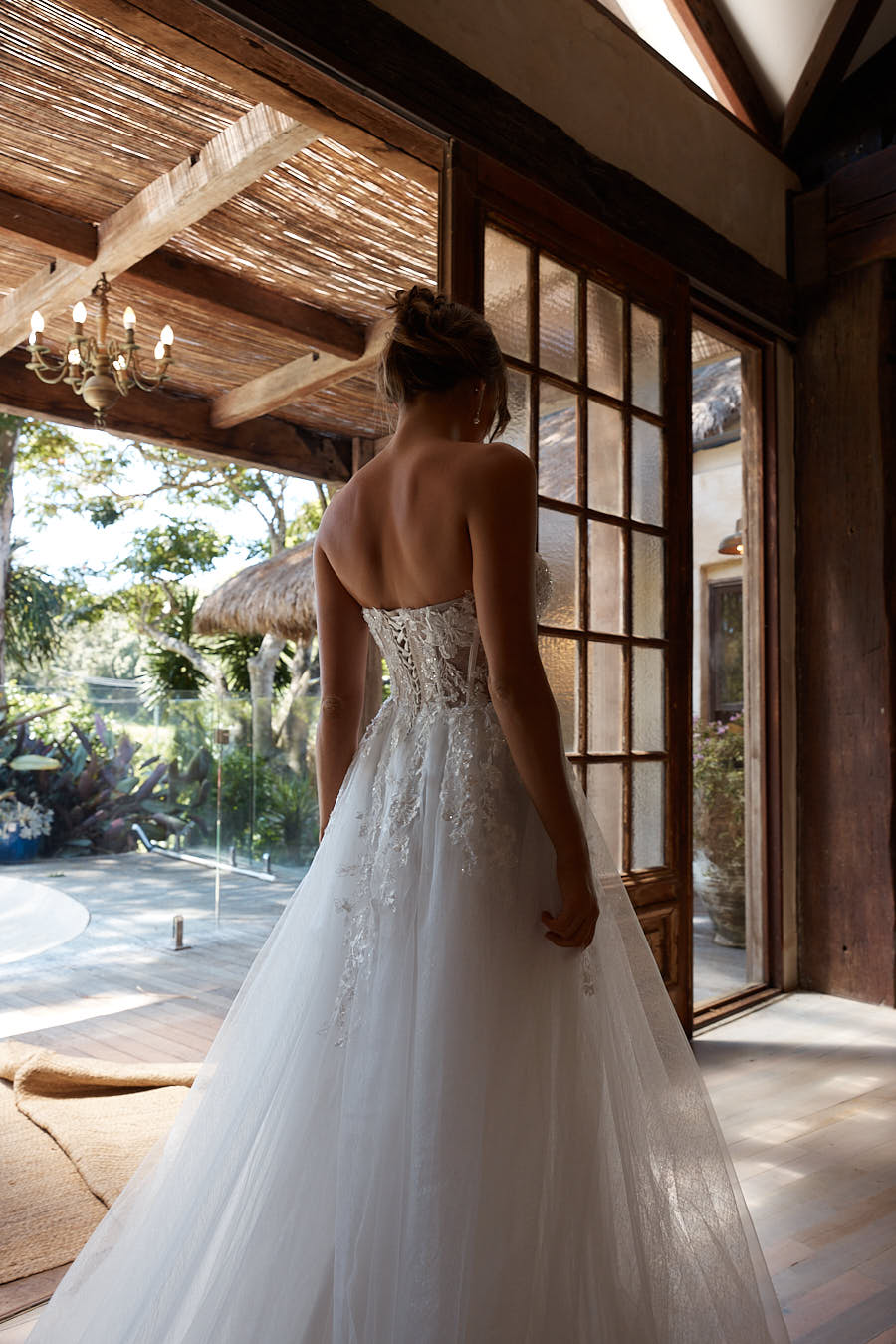 The skirt is made of layered tulle with a glitter patterned tulle under the second layer, giving the dress an ethereal and dreamy feel. The chapel skirt train adds a touch of romance, making this dress perfect for a fairytale wedding. The lace-up back corset allows for a perfect fit, while the skirt zip closure ensures that the dress stays secure throughout the day.