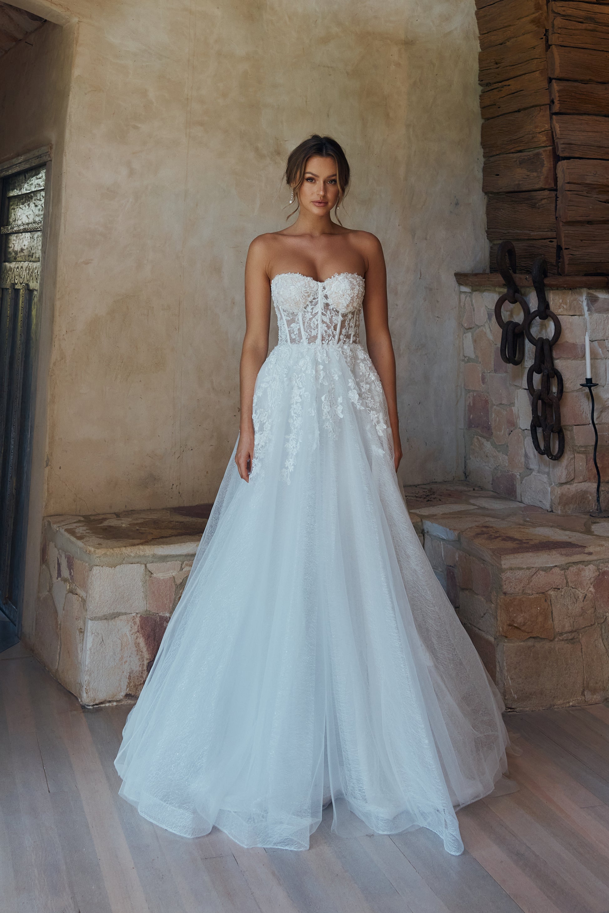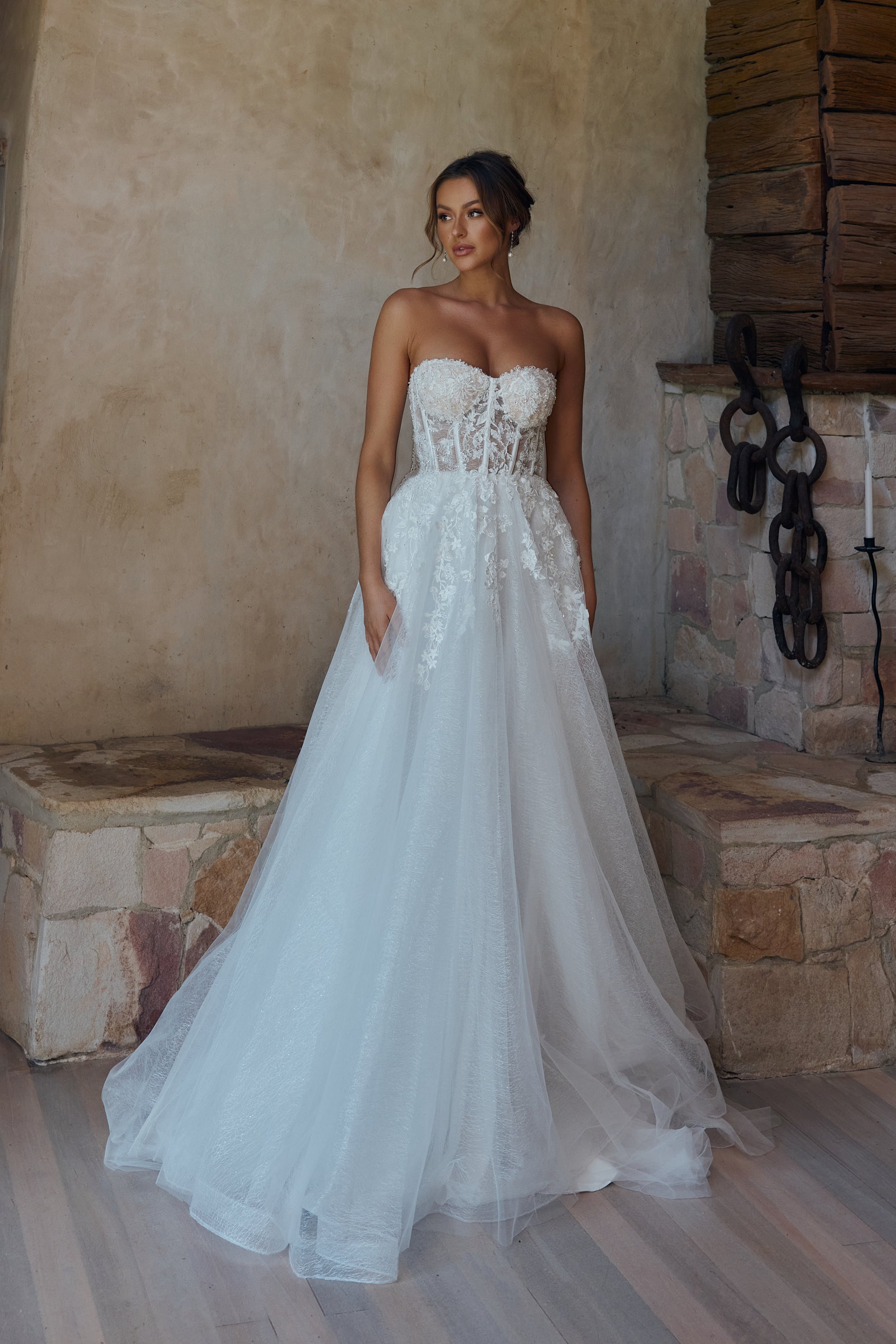 Introducing the stunning and captivating Maia TC2335 dress! This dress is perfect for brides who want to look absolutely breathtaking on their special day. The bodice features a structured corset design with exposed boning and is layered with glitter tulle for a hint of sparkle. The beaded lace applique detailing on the bodice adds a touch of elegance and sophistication.