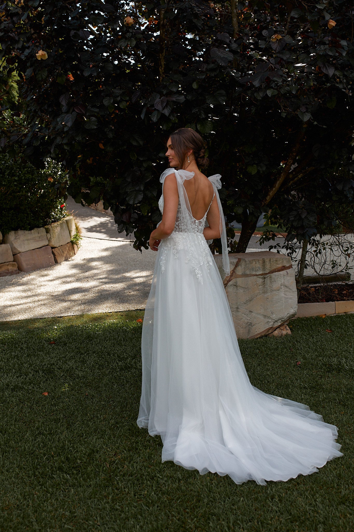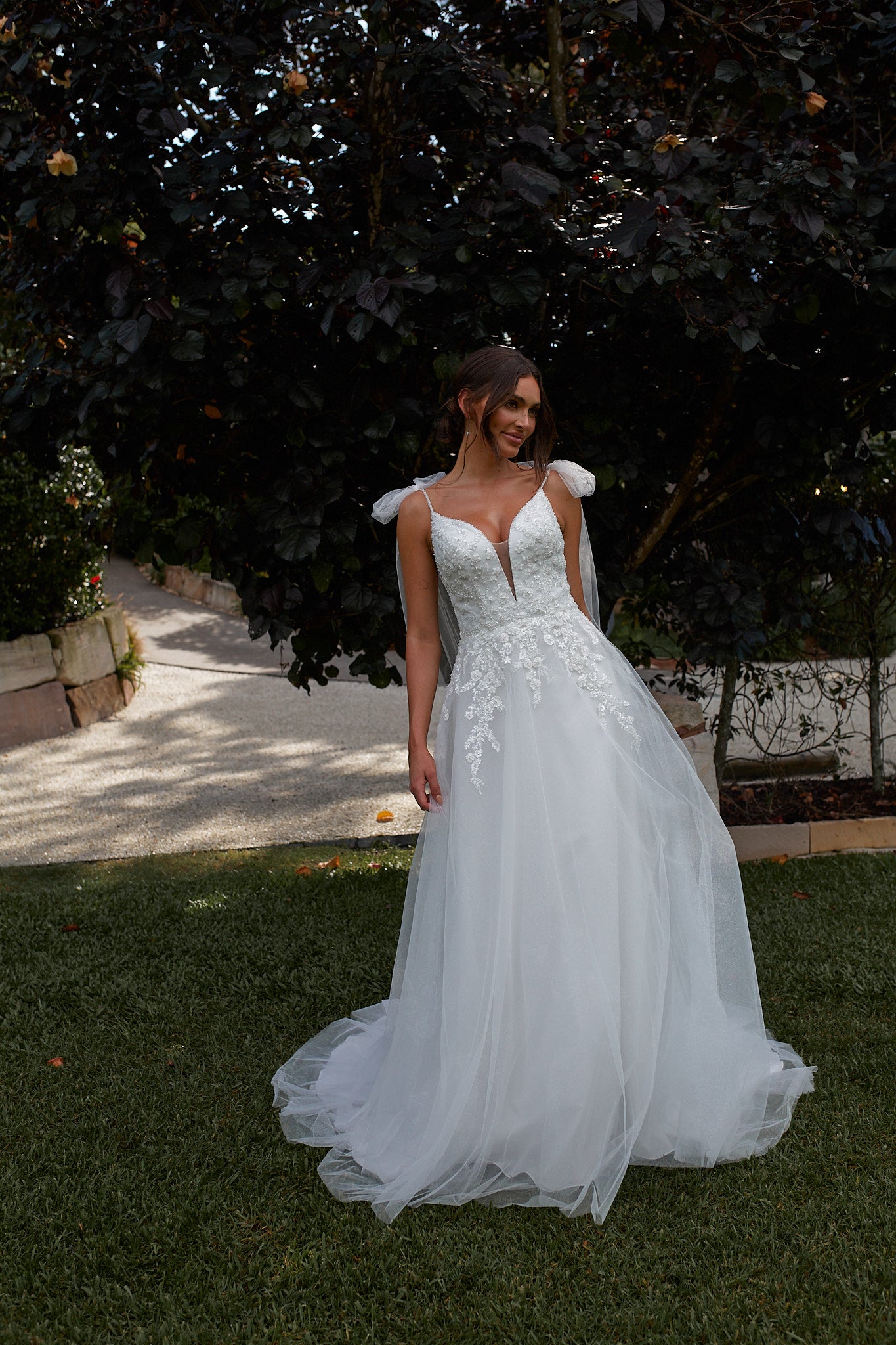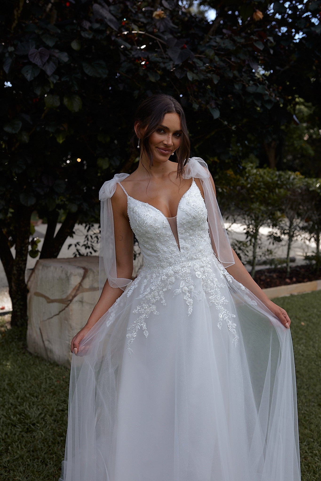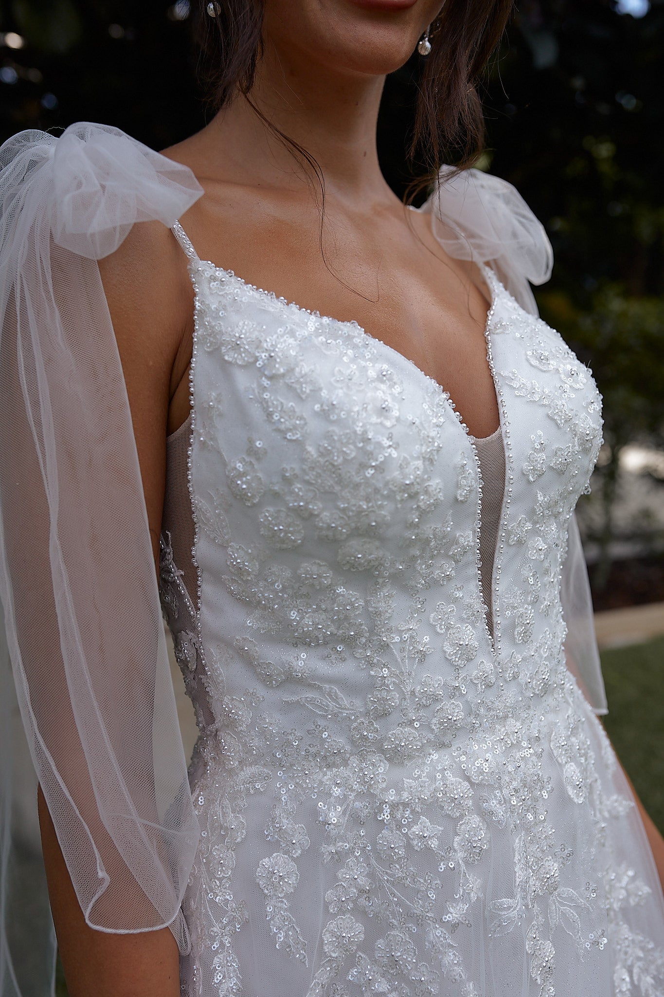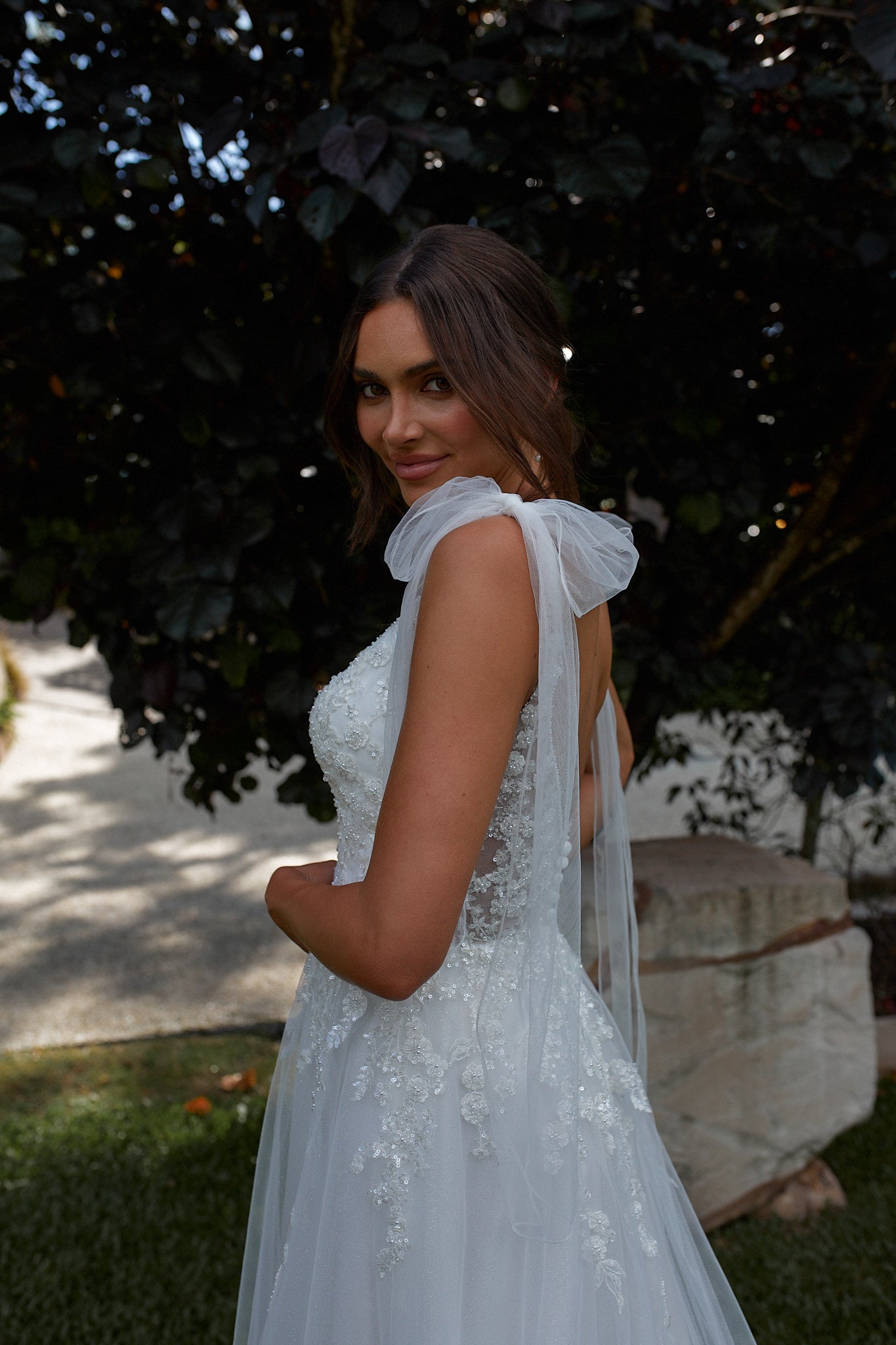 Introducing the Waratah wedding dress, your modern fairy tale in the making. Crafted with beaded lace applique and soft ethereal tulle. Effortlessly chic with beaded thin straps and detachable tulle bows, it offers versatility with a touch of whimsy. The plunging neckline, subtly trimmed with beading and featuring a tulle center front cutout. Warratach also boasts Lace applique with delicate beading, sheer side cutouts, and optional sheer lace back, lined or unlined, cater to your style. With built-in support and an invisible zip/button closure.