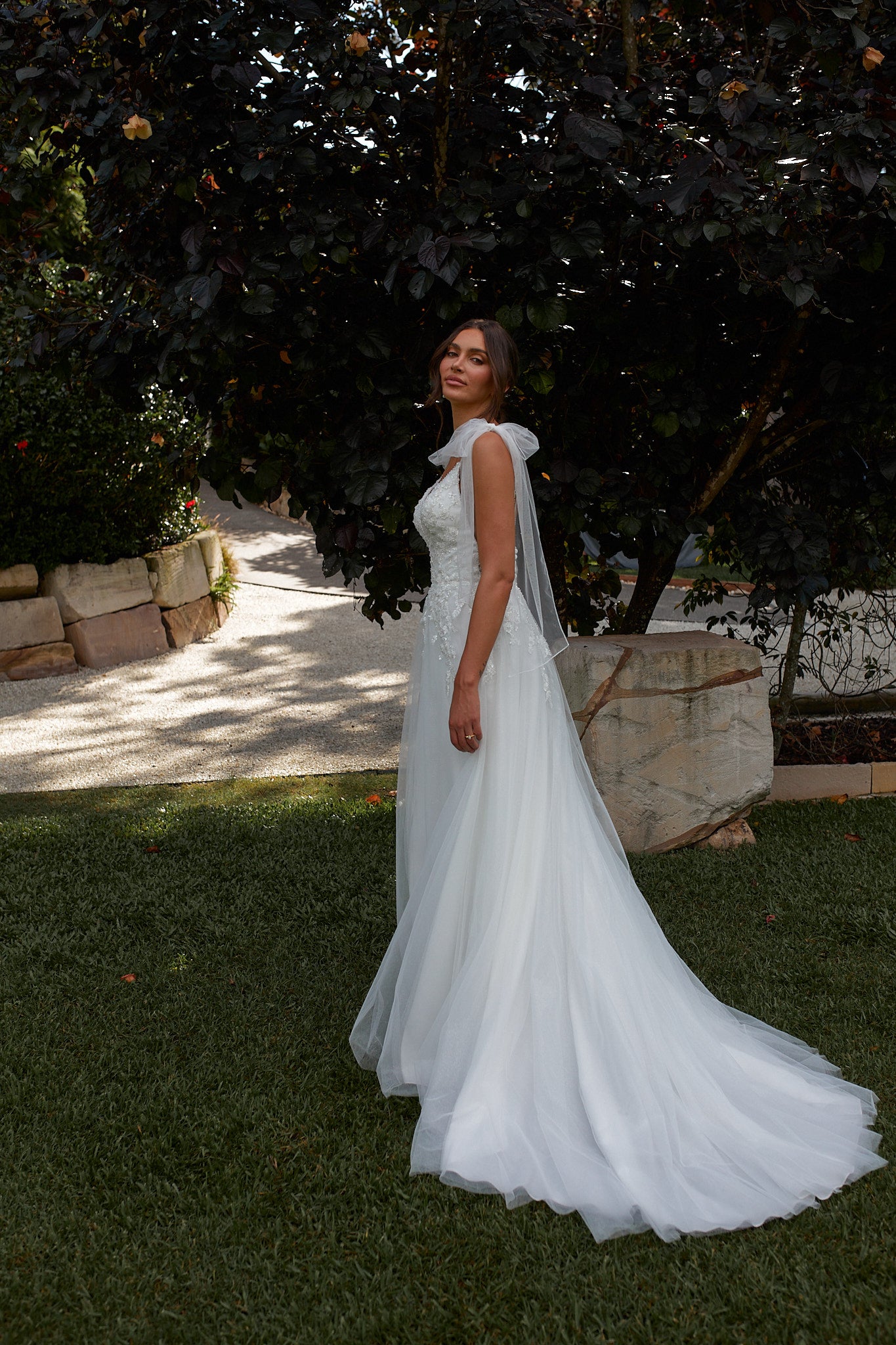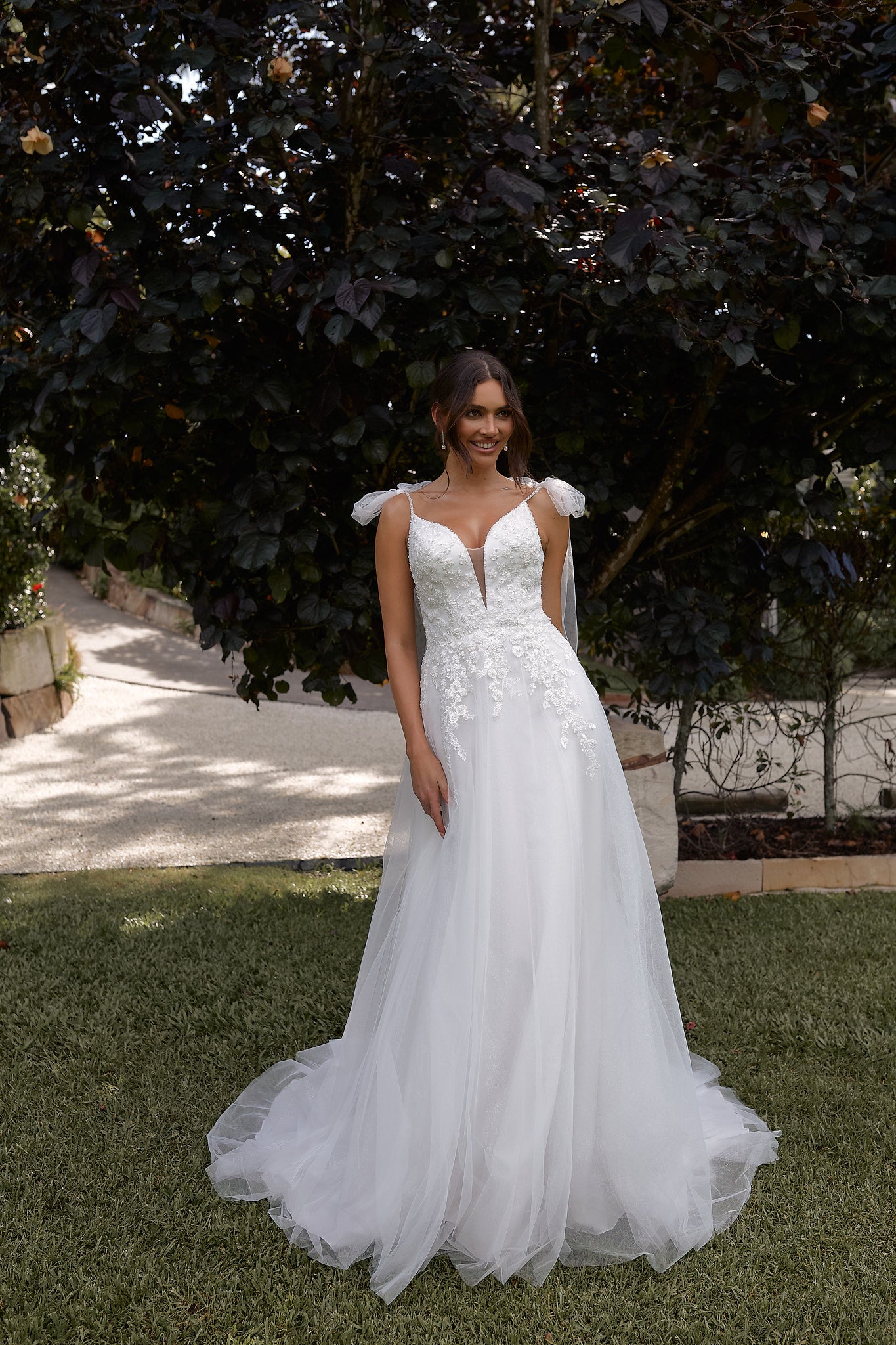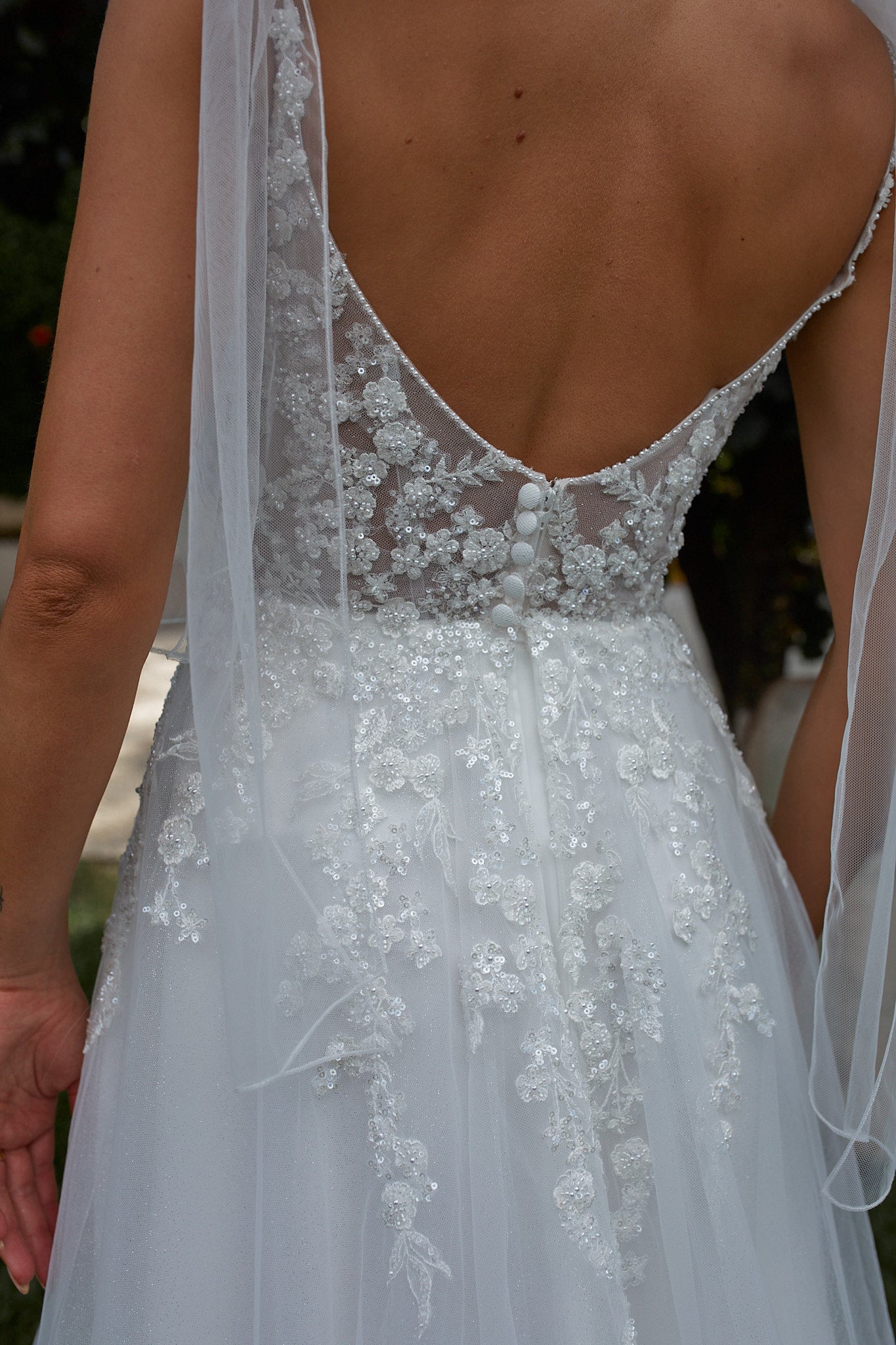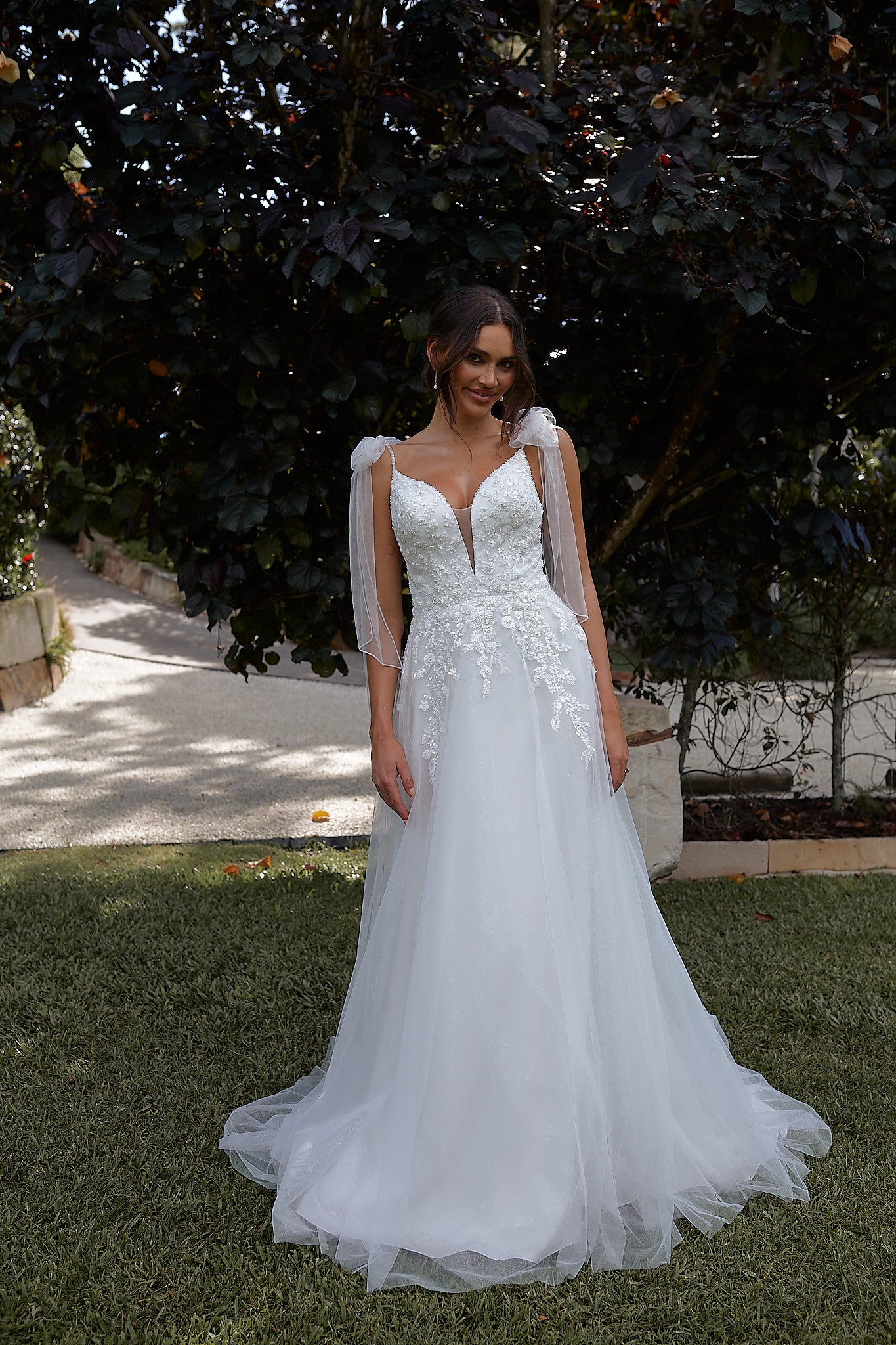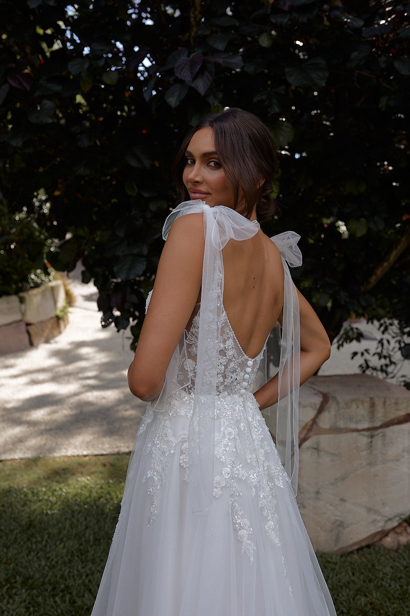 Introducing the Waratah wedding dress, your modern fairy tale in the making. Crafted with beaded lace applique and soft ethereal tulle. Effortlessly chic with beaded thin straps and detachable tulle bows, it offers versatility with a touch of whimsy. The plunging neckline, subtly trimmed with beading and featuring a tulle center front cutout. Warratach also boasts Lace applique with delicate beading, sheer side cutouts, and optional sheer lace back, lined or unlined, cater to your style. With built-in support and an invisible zip/button closure.