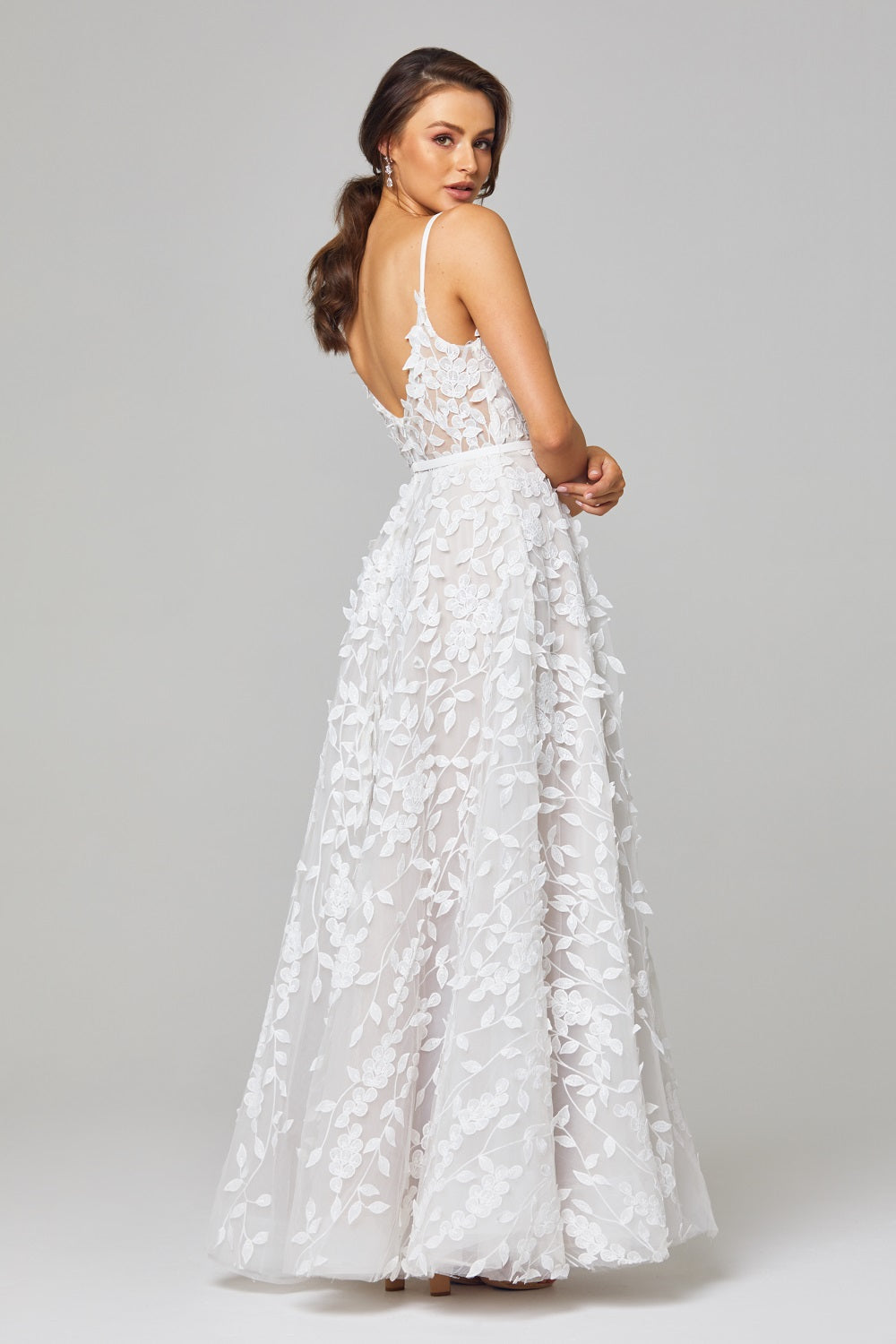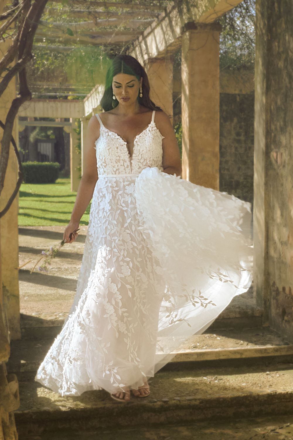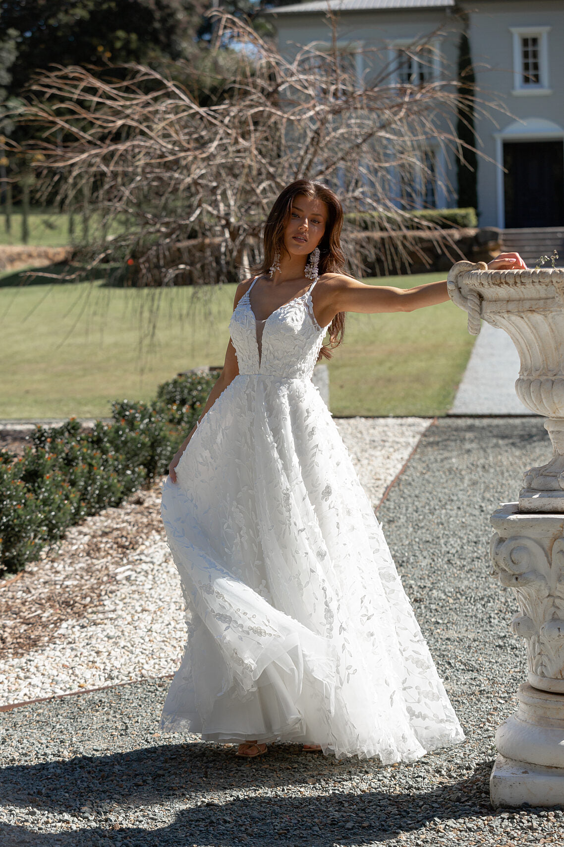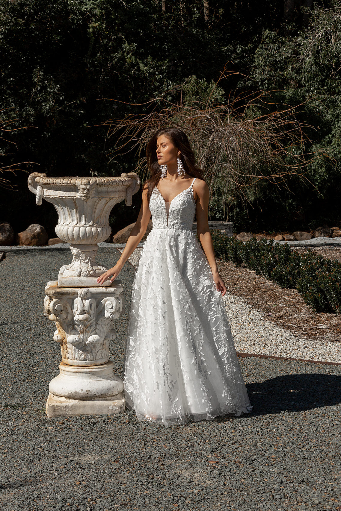 The Amy features a structured bodice with a plunging v-neckline set with shoulder straps that fall into a v-back. From its thinly belted waistline falls an A-line silhouette floor length skirt which gets it shape from the light layers of tulle beneath the outer layer. The entirety of this gown is adorned with 3D floral lace which truly sets it apart from other wedding dress designs. The Amy would be make the perfect garden wedding dress due to the floral design elements throughout.