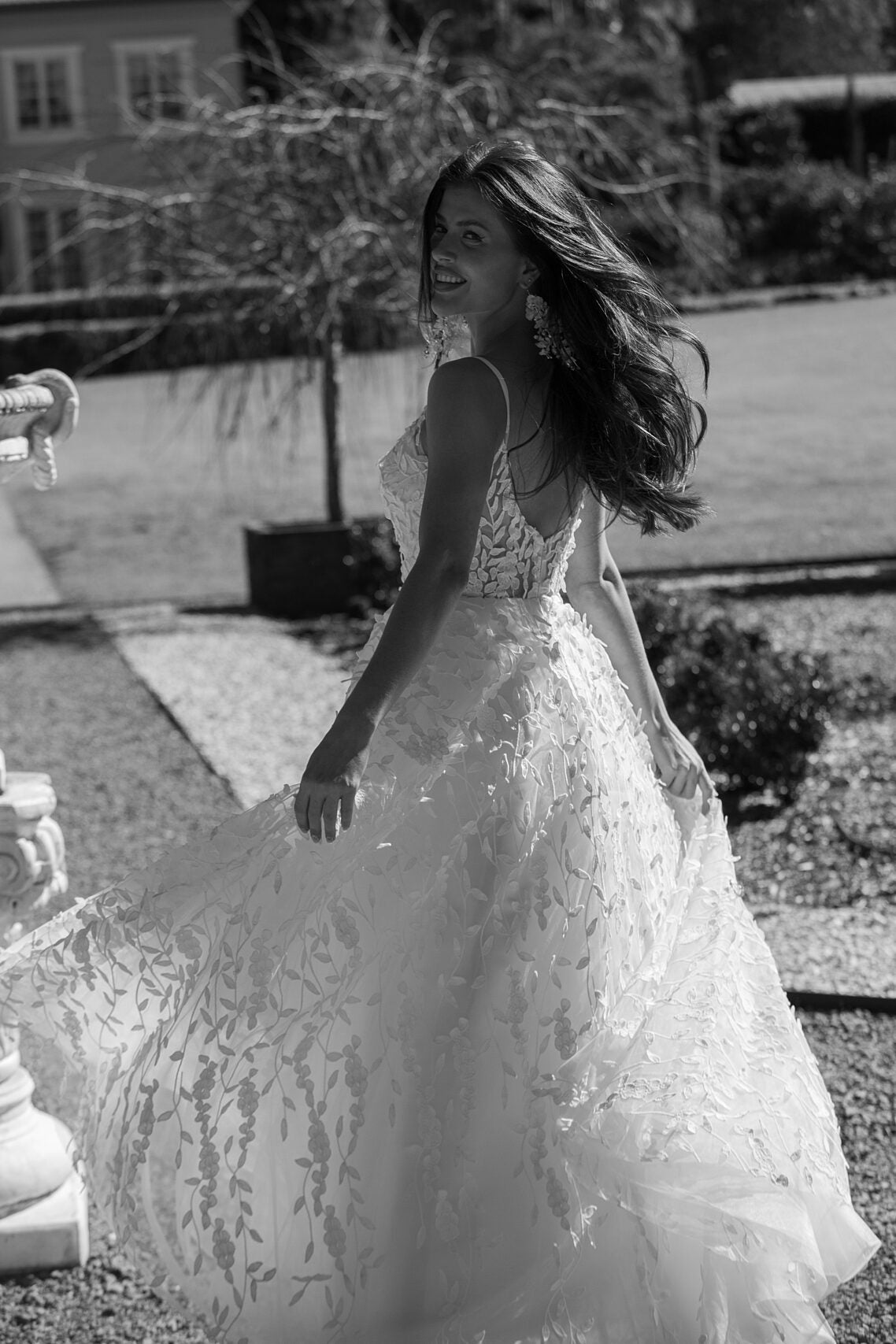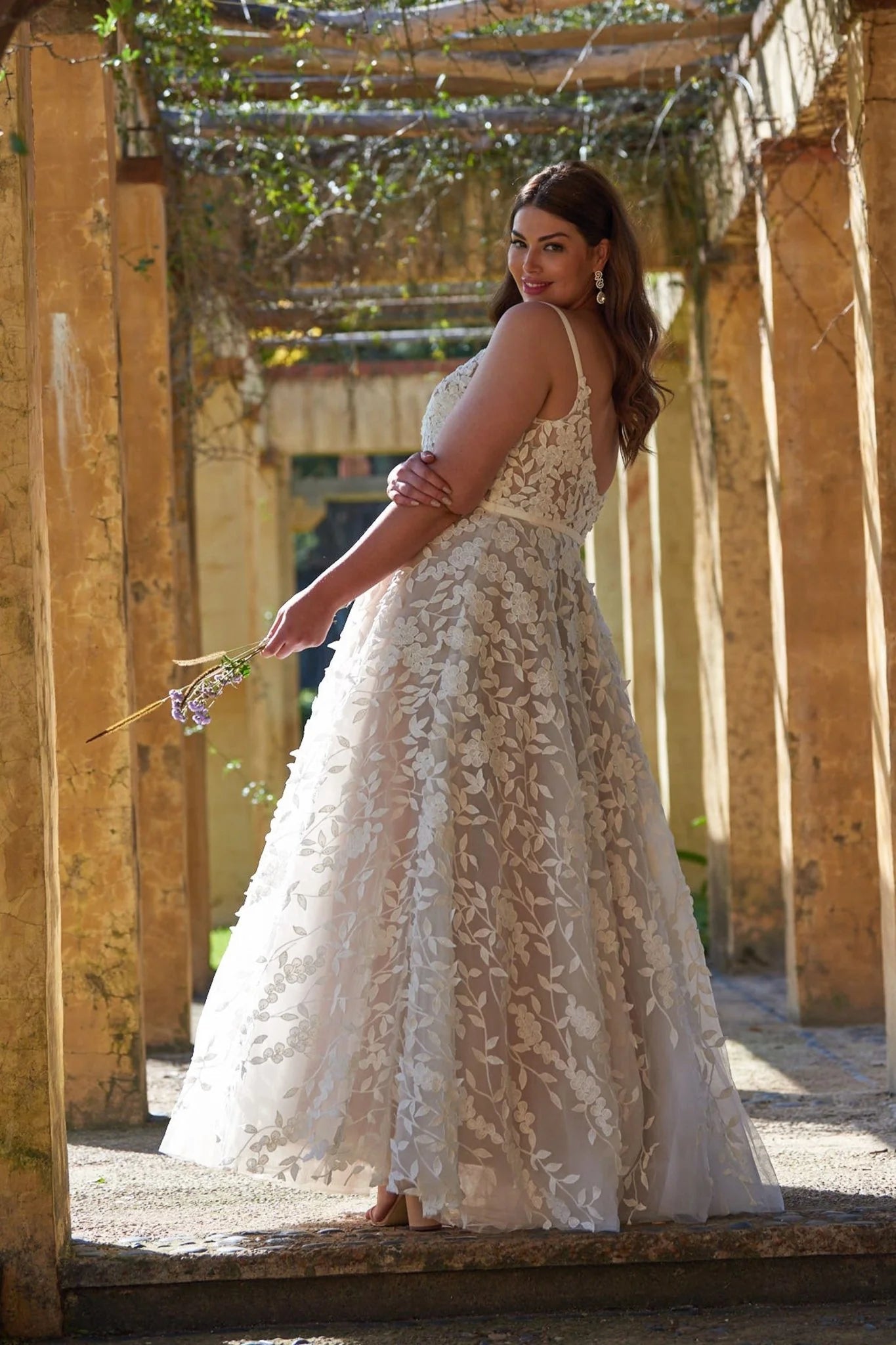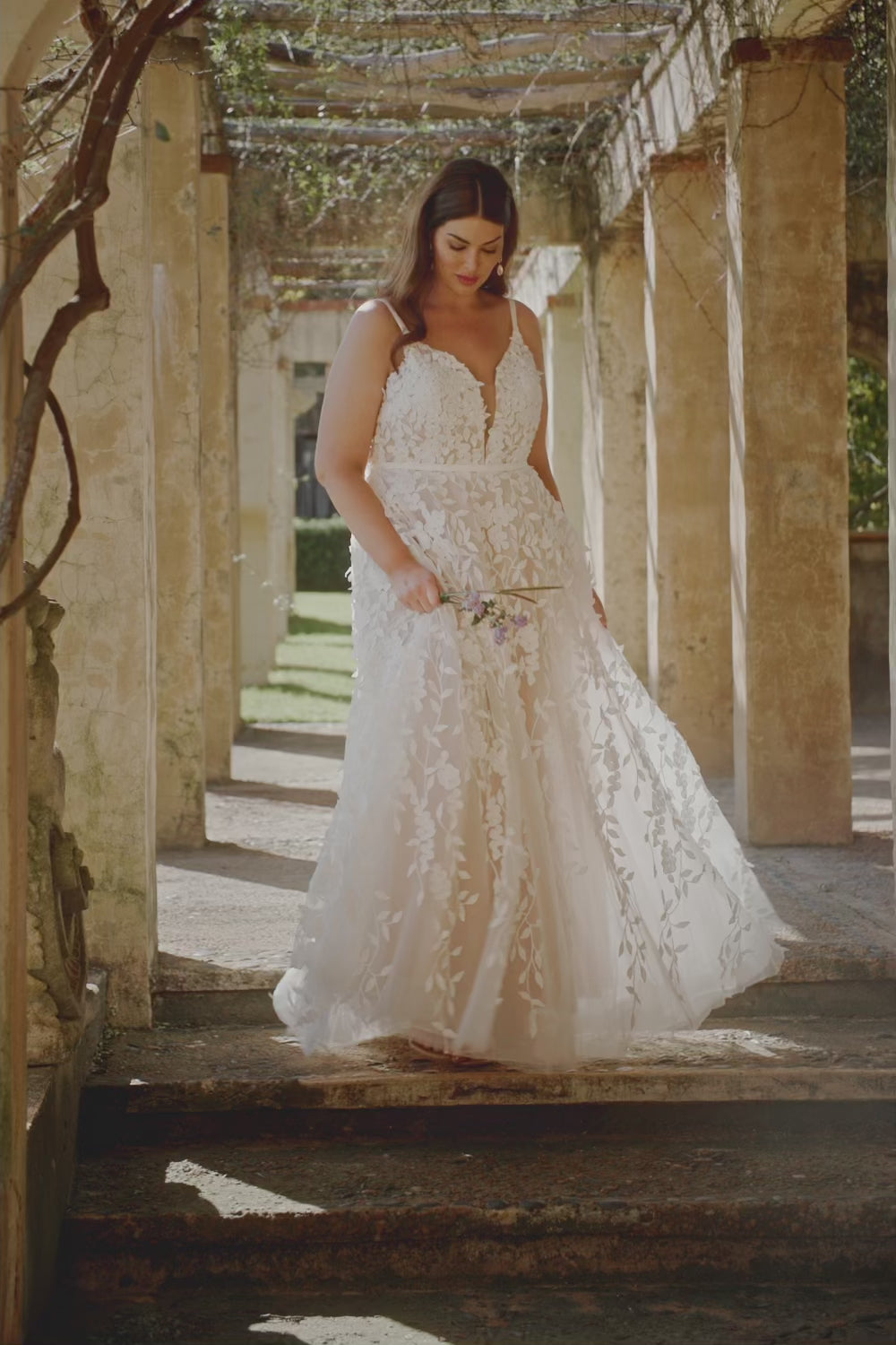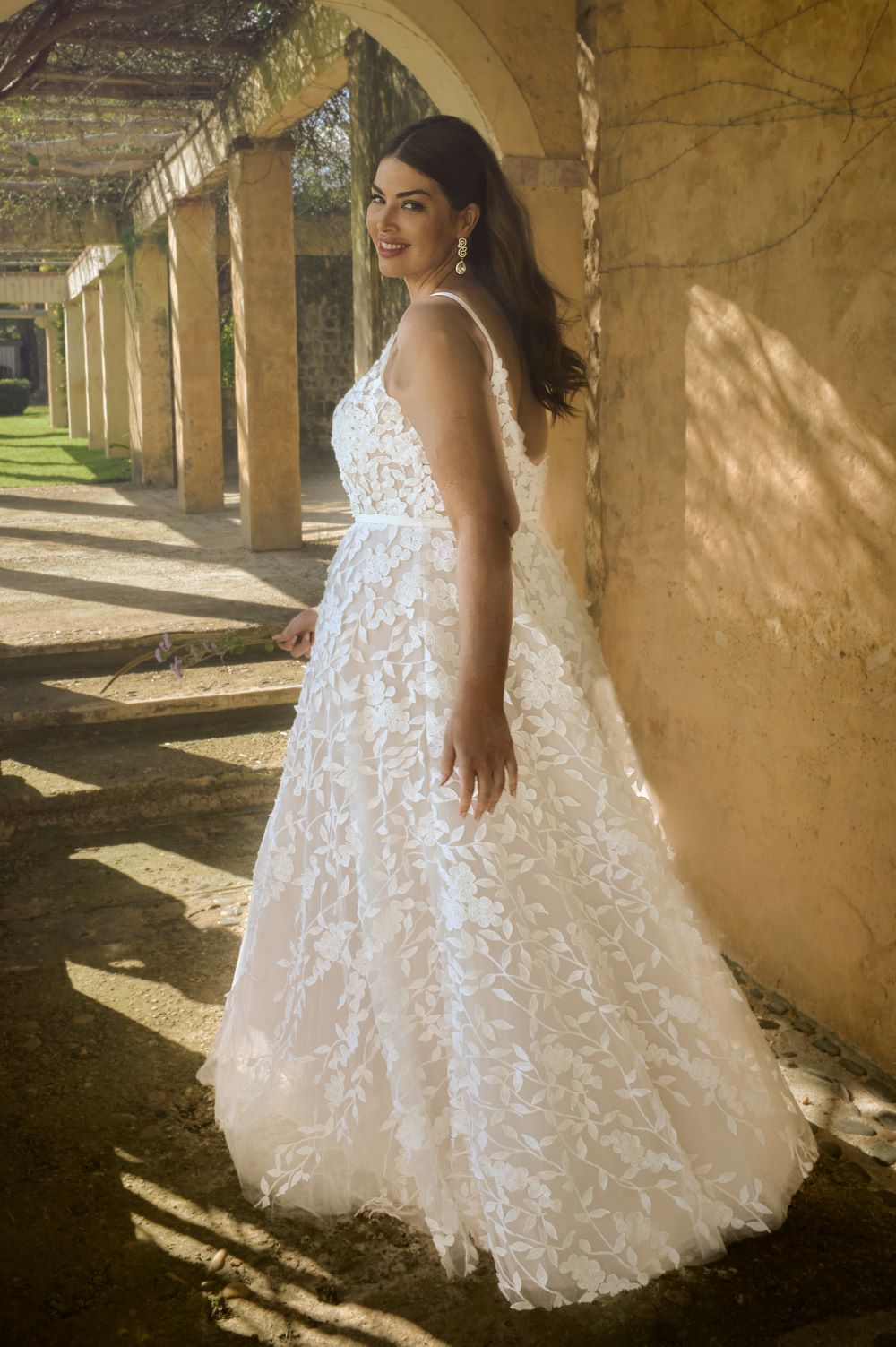 The Amy features a structured bodice with a plunging v-neckline set with shoulder straps that fall into a v-back. From its thinly belted waistline falls an A-line silhouette floor length skirt which gets it shape from the light layers of tulle beneath the outer layer. The entirety of this gown is adorned with 3D floral lace which truly sets it apart from other wedding dress designs. The Amy would be make the perfect garden wedding dress due to the floral design elements throughout.