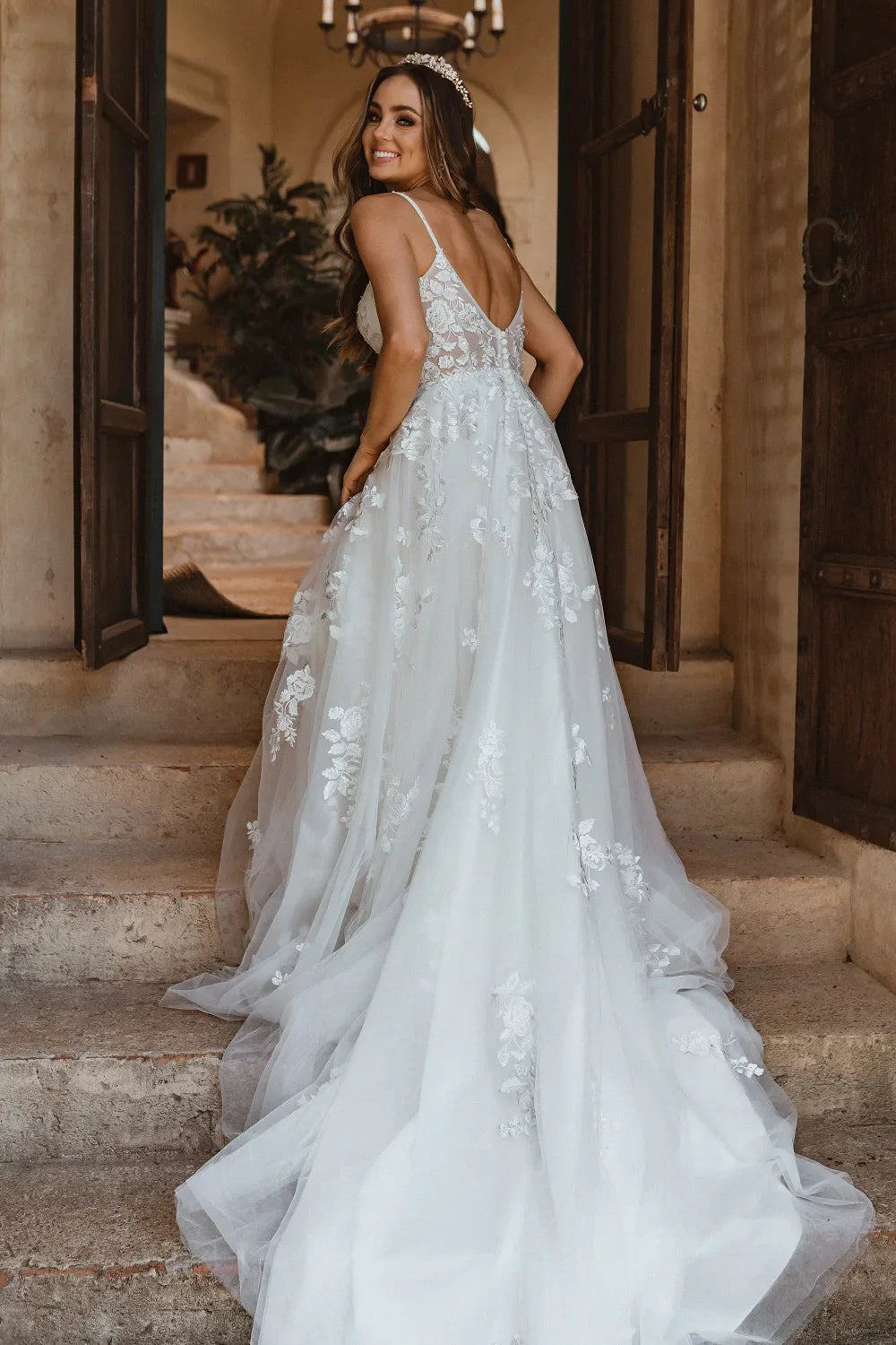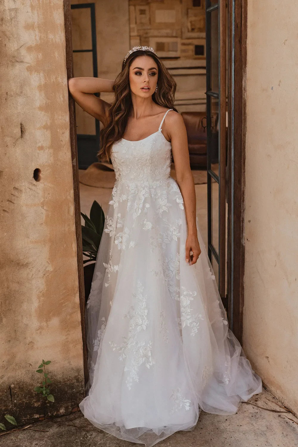 The Byron features a fitted beaded lace bodice with a softly scooped neckline and spaghetti straps that sit over the shoulders and fall into a low v-shaped back. The rear of the bodice is unlined to create a striking translucent back with button and loop closures. From the waistline falls an A-line silhouette skirt crafted with layers of soft tulle and a continuation of carefully placed floral lace applique. One of the standout features of the Byron is its long accompanying train for the bride who dreams of a fairytale wedding dress. The Byron is available in vintage white and vintage white with nude lining in sizes AU 4-30.
